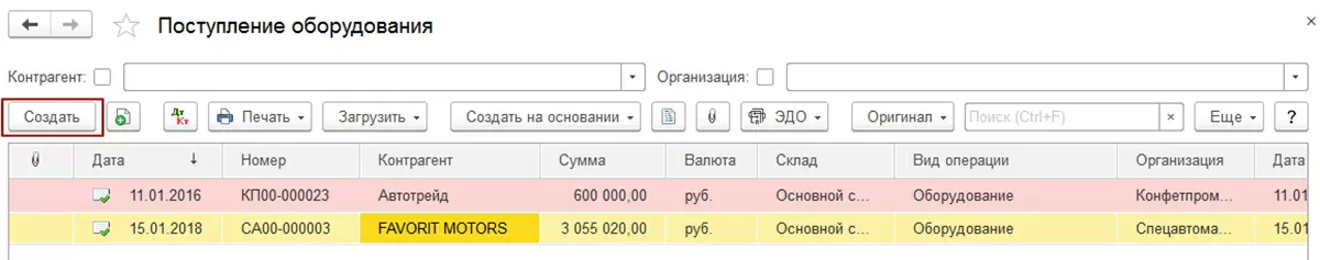Рассмотрим, каким образом провести поступление основных средств, а также оборудования.