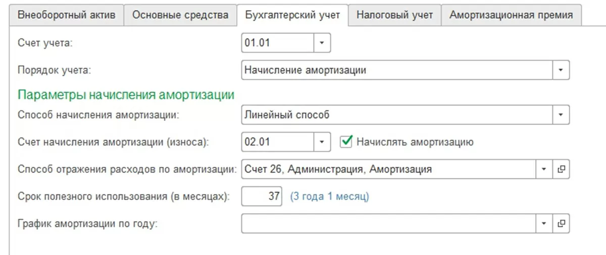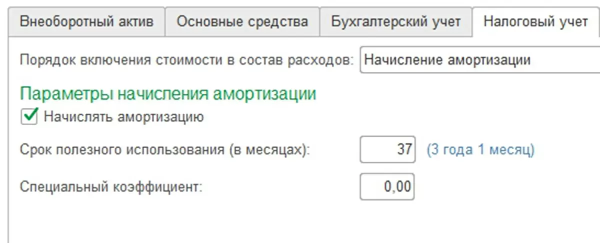 На закладках «Бухгалтерский учет» и «Налоговый учет» заполним все необходимые данные в соответствии с особенностями объекта ОС.
