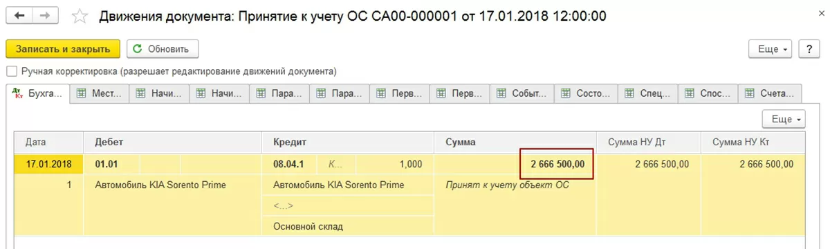 Рассматриваемый документ предусматривает регистрацию поступления внеоборотного актива в качестве ОС, постановка на учет и ввод его в эксплуатацию, а также формирование проводок: