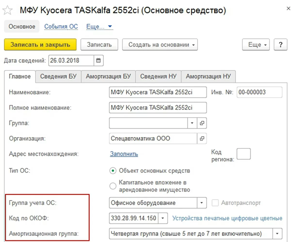 Для корректного начисления амортизации обязательно нужно заполнить в карточке группу учета, код общероссийского классификатора основных фондов (ОКОФ) и амортизационную группу. ОКОФ должен быть предварительно загружен в систему из внешнего файла, который поставляется с пакетом установки конфигурации.