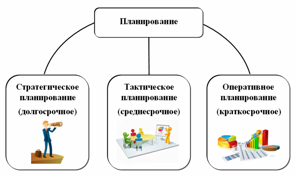 - Среднесрочное/тактическое – от 1 до 5 лет, устанавливает средства, требуемые для исполнения стратегических целей.