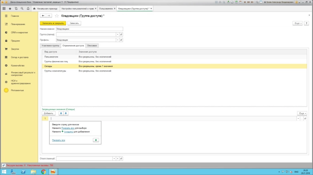 На скриншоте видно, что документ «Ввод начальных остатков» доступен для пользователя, но доступ возможен только к определенным складам.