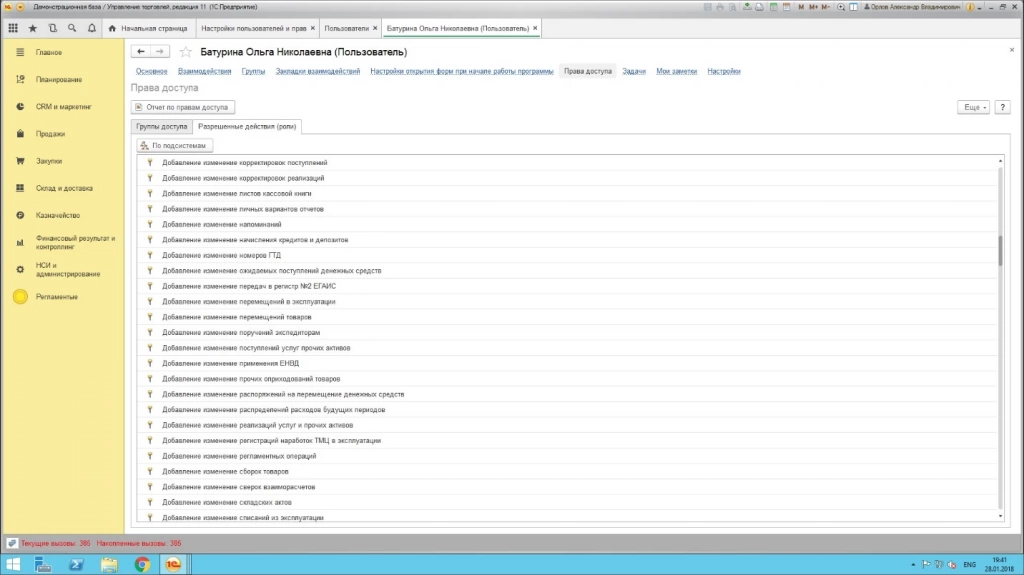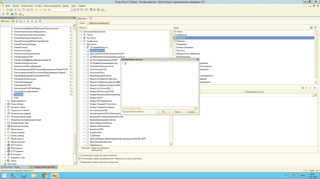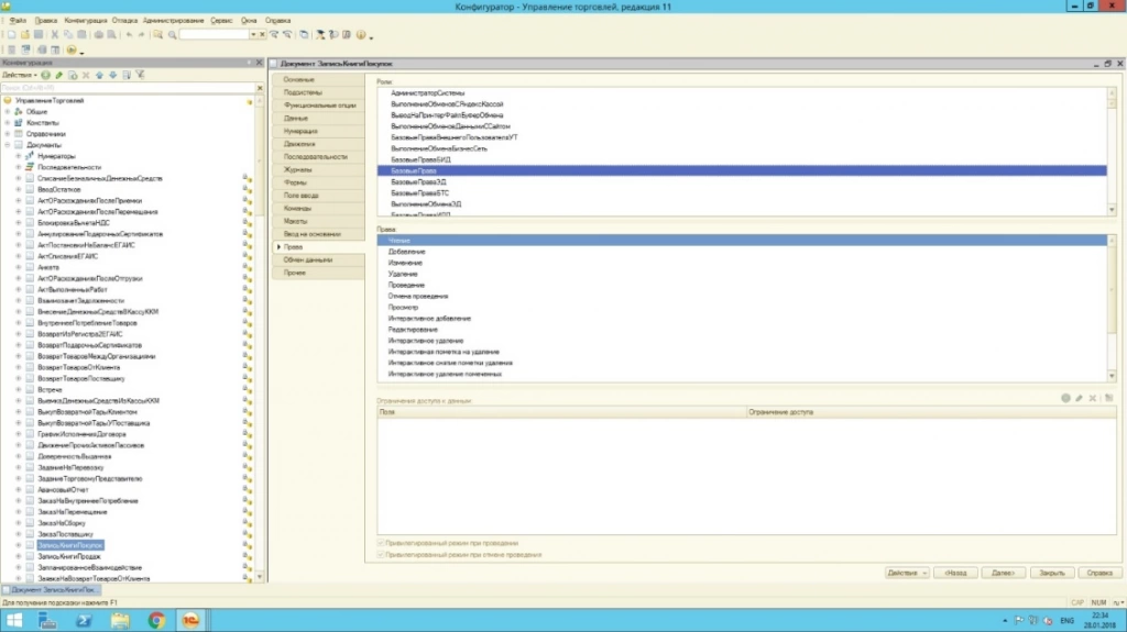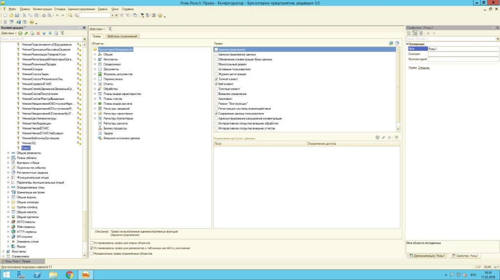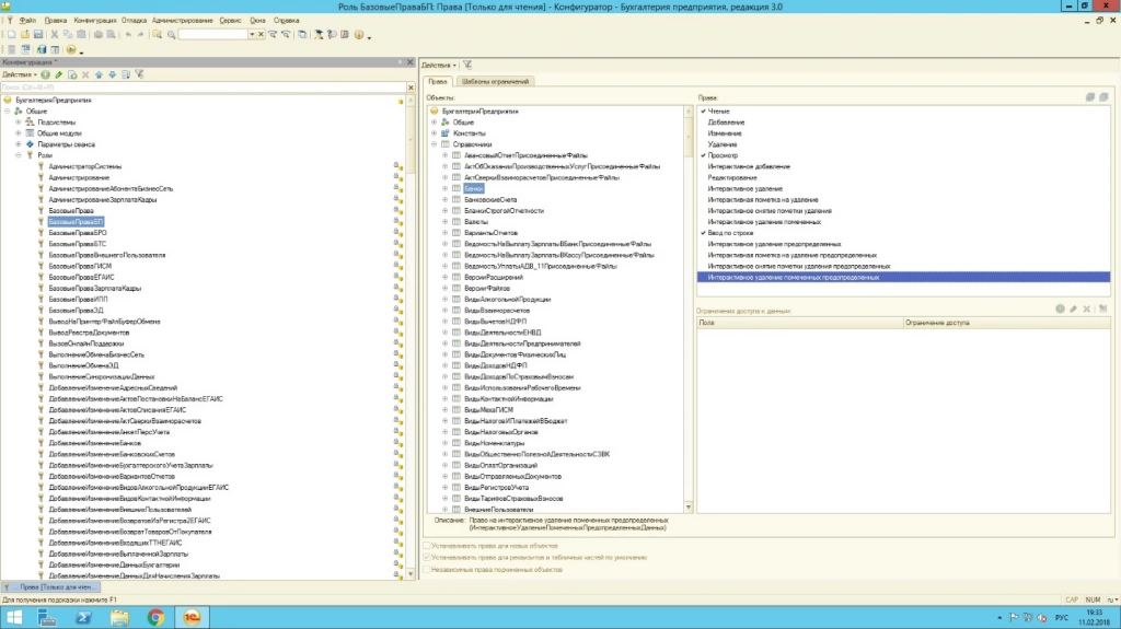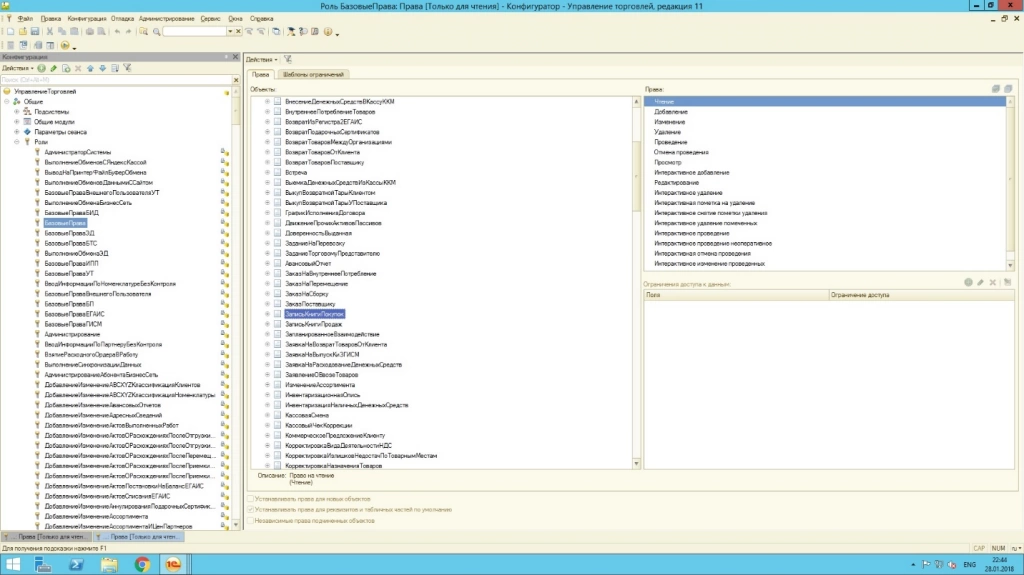 Права администратора позволяют осуществлять управление правами в режиме конфигуратора, где уже заданы типовые роли. Например, роль с много объясняющим названием «Базовые права», как правило, дает возможность осуществить только чтение или только просмотр объекта.