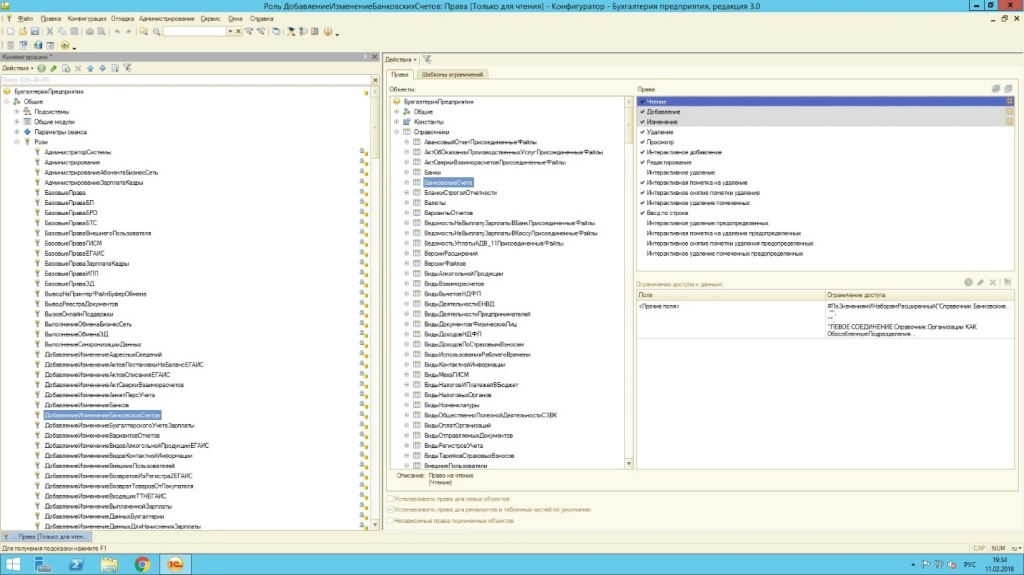 - Открыть роль, назначенную пользователю, и, выбрав в левом окне конкретный объект, в правом окне увидеть список прав, то есть действия, которые пользователь с данной ролью может сделать с этим объектом – чтение, добавление, просмотр т.д.