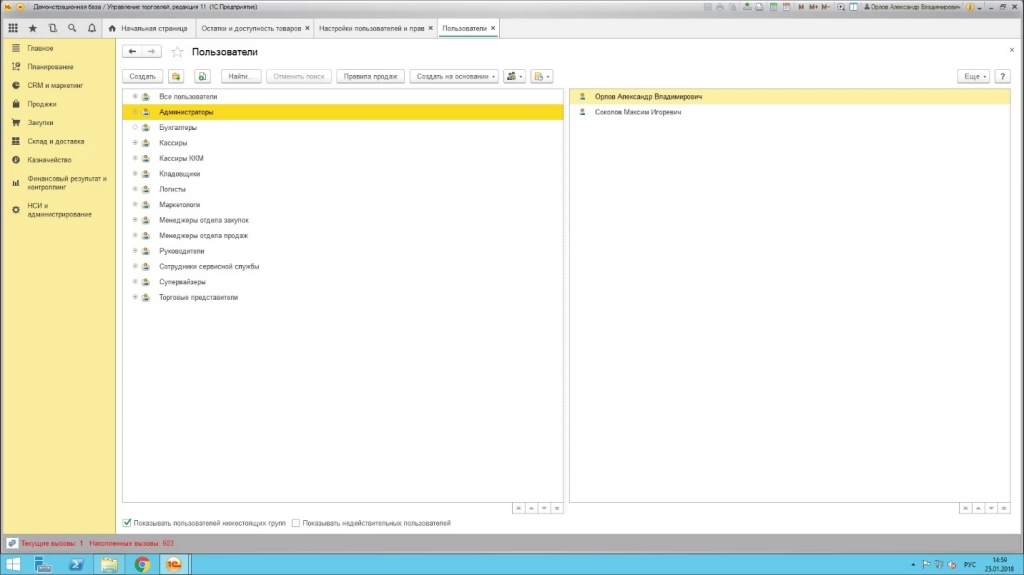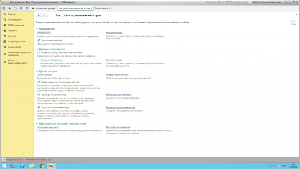 Чтобы внести коррективы в правила доступа и изменить права на просмотр того или иного раздела или на любое другое действие, необходимо зайти в «Настройки пользователей и прав», что можно сделать при включенном пользовательском режиме на вкладке «Администрирование» (при условии, конечно, что имеются права на это).