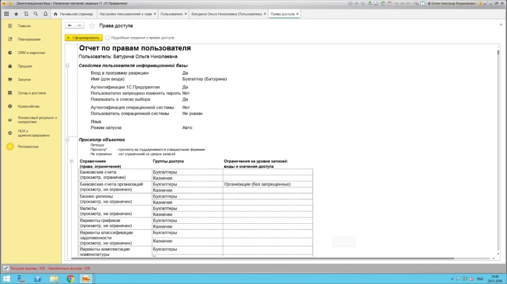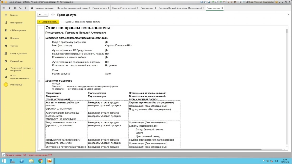 Здесь же формируется отчет по правам доступа, где отображается статус доступа к конкретным объектам системы.