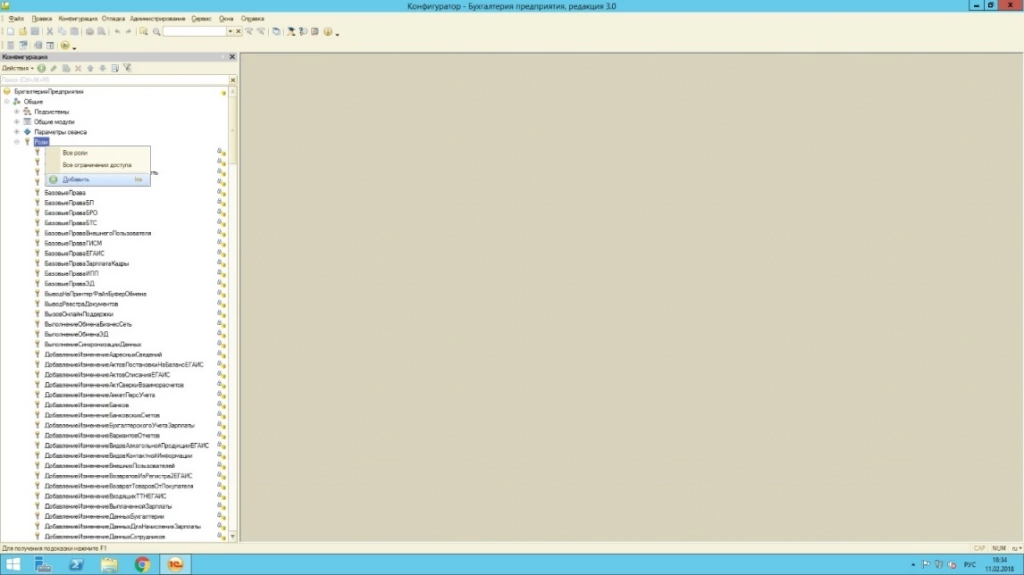 На практике же, как правило, в большинстве случаев все-таки необходима «защита от дурака». Подстраховаться от нежелательного изменения данных нужно всем более-менее крупным компаниям. Здесь на помощь приходит встроенные в 1С роли. Разобраться в разнообразии ролей не просто, на это требует много времени. Поэтому создание собственной роли для решения практических задач, зачастую может быть единственным выходом. Рассмотрим этот момент подробнее. Добавить роль можно в дереве метаданных.