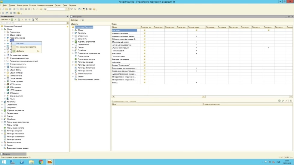 Таким образом, все возможные права в системе предопределены. Чтение, добавление, изменение, просмотр, редактирование и другие права могут быть включены или выключены в любой роли для любого объекта. Назначить права отдельно, не используя при этом роли, невозможно. Для разграничения прав пользователя необходимо назначить соответствующую роль. Удобным инструментом для анализа прав и ролей становится таблица «Все роли», формируемая в конфигураторе.