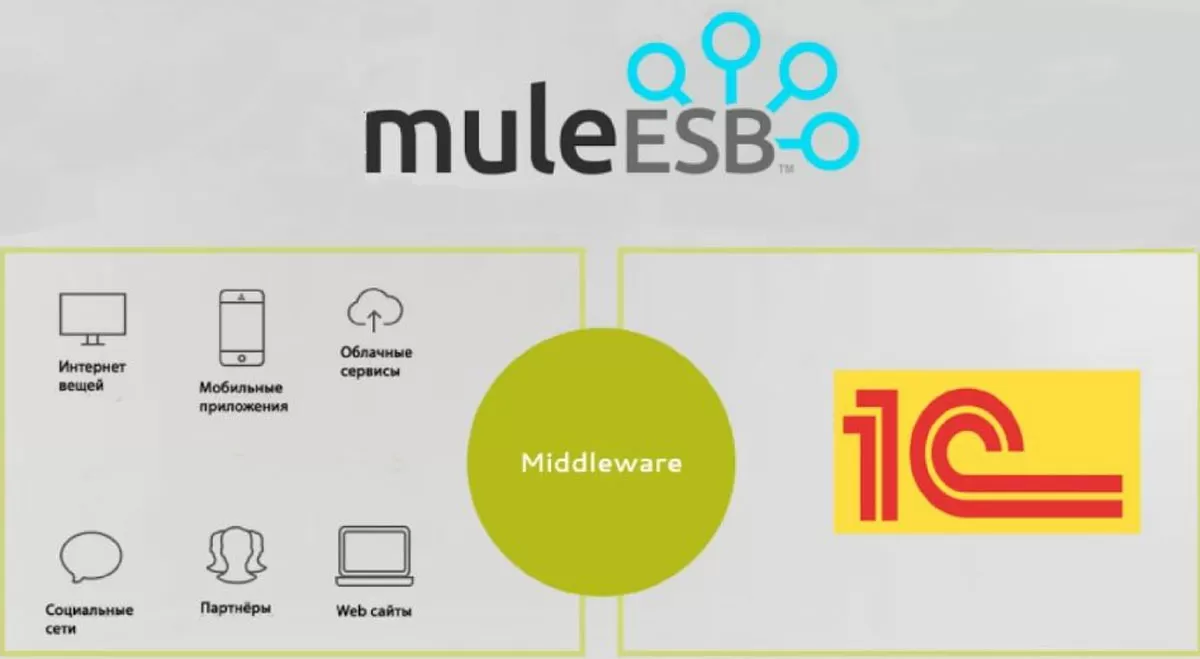 Среда Cloud-сервисов, помимо самих сервисов, может включать мобильные приложения, вебсайты, социальные сети, мессенджеры, которые требуется интегрировать с 1С. MuleESB в этом случае используется как Middleware – некая «прослойка» между Интернетом с cloud-сервисами и Incorporate 1С (если HTTP-сервис 1С все еще опубликован вне локальной сети – об этом будет ниже*). Это делается, чтобы не прибегать к функционально мощной шине, поскольку ESB просто не нужна, если систем «внутри» нее не сотни или хотя бы не десятки.
