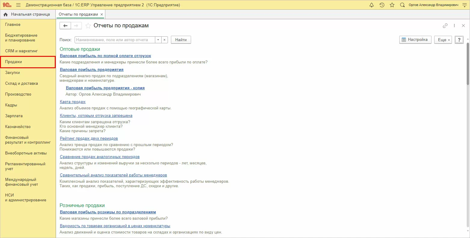 Второй шаг. Выявить причины, которые привели к снижению прибыли, посмотрев отчетность по продажам. Такие отчеты позволяют провести комплексный анализ показателей, характеризующий эффективность работы бизнеса. В программе «1С:ERP» имеется целый блок отчетов в разделе «Продажи».