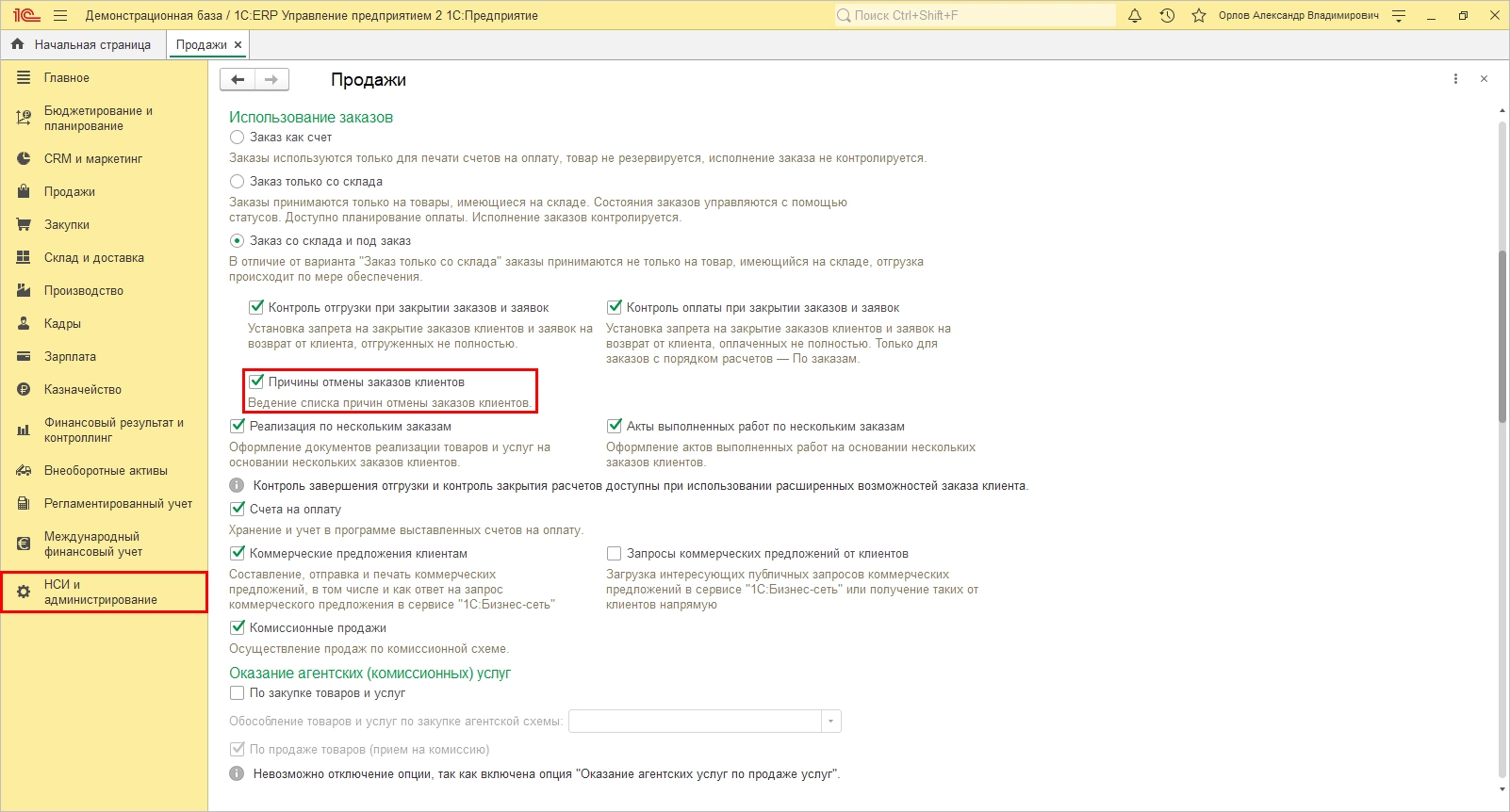 Для возможности регистрации причин отказов клиента в программе «1С:ERP», в разделе «НСИ и администрирование» - «Продажи», проставляется галочка на «Причины отмены заказов клиентов».