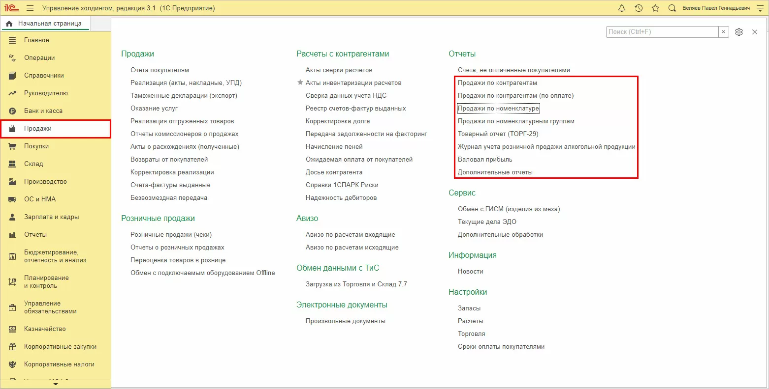 Группа отчетов в «1С:Управление холдингом», раздел «Продажи», позволяет провести анализ продаж в разрезе контрагентов, номенклатуры, по номенклатурным группам, проанализировать валовую прибыль компании.