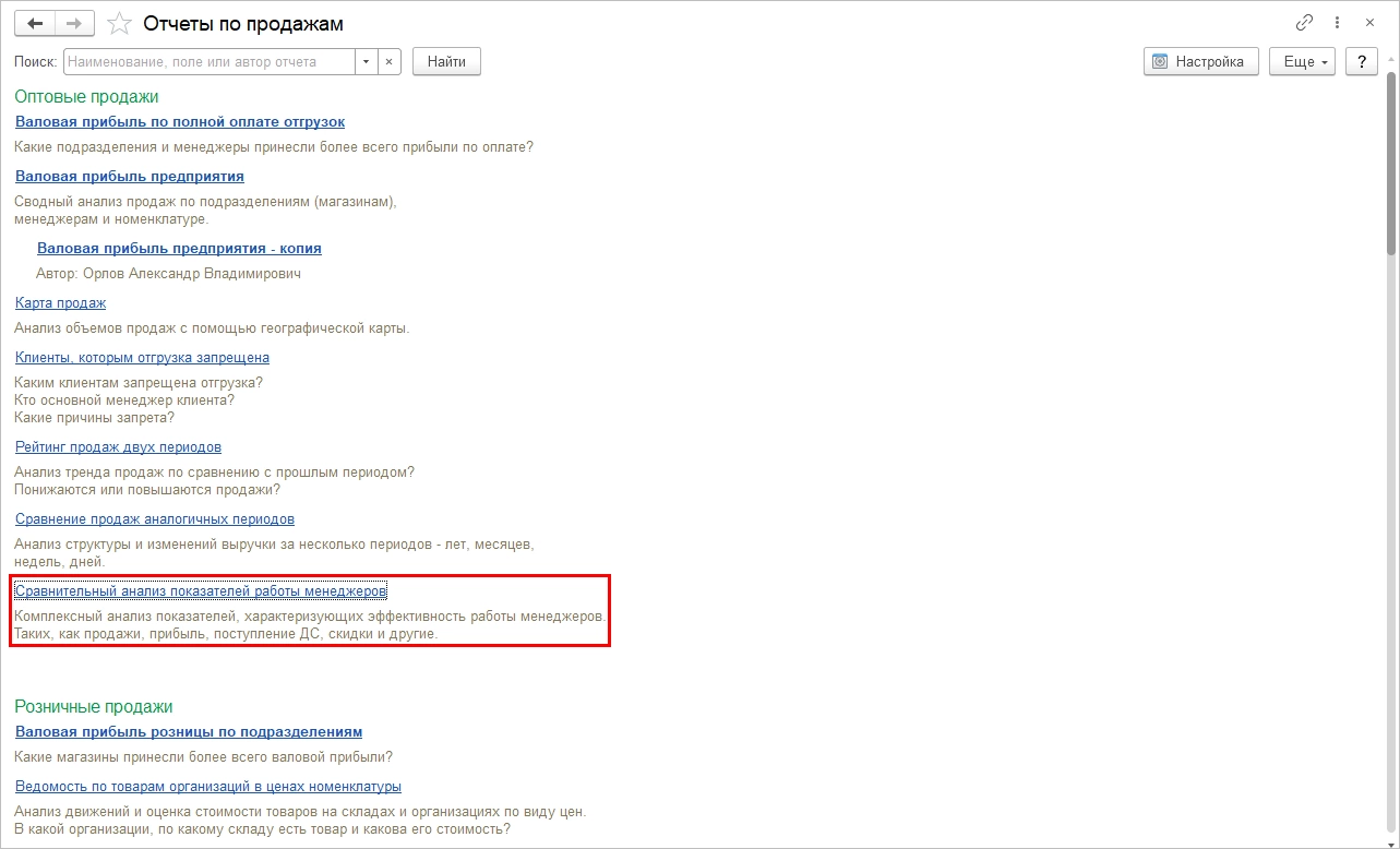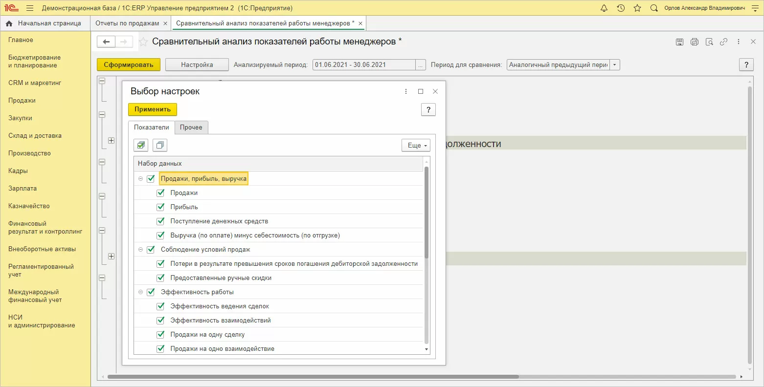 С их помощью пользователь может проанализировать продажи по подразделениям и менеджерам, по номенклатуре, провести анализ продаж с помощью географической карты, сравнить продажи двух периодов. В настройках отчета пользователь может задать показатели для анализа и установив период сравнения данных: