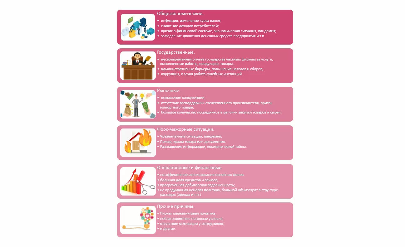 Финансовые – неэффективное использование денежных средств, кредитов, займов, неправильная ценовая политика компании, большие объемы затрат в составе расходов, например, аренда, лизинг и т.п., а также допущение просроченной дебиторской задолженности.