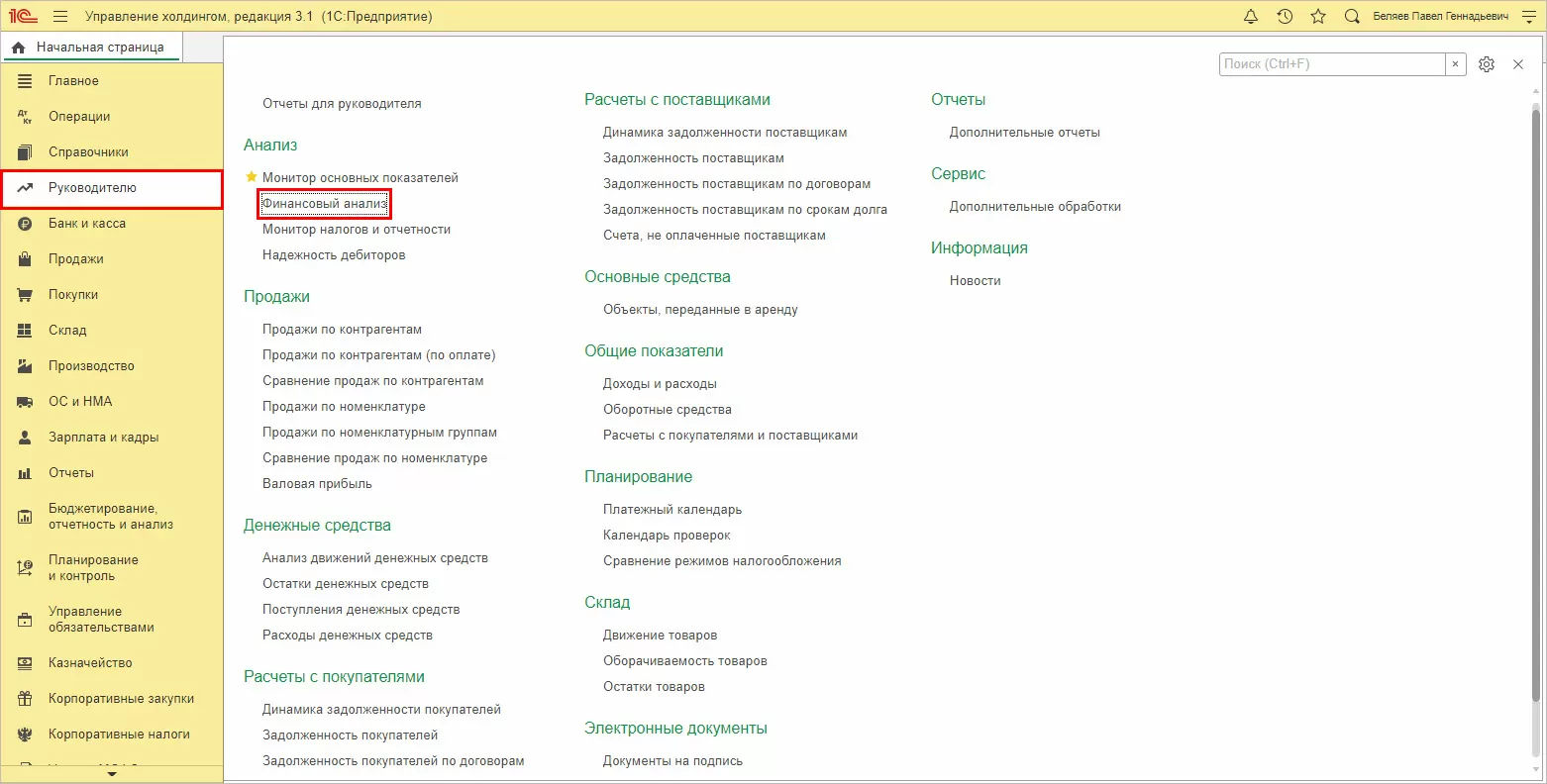 В «1С:УХ», чтобы следить за финансовым состоянием компании, нужно зайти в раздел «Финансовый анализ» в блоке инструментов «Руководителю».