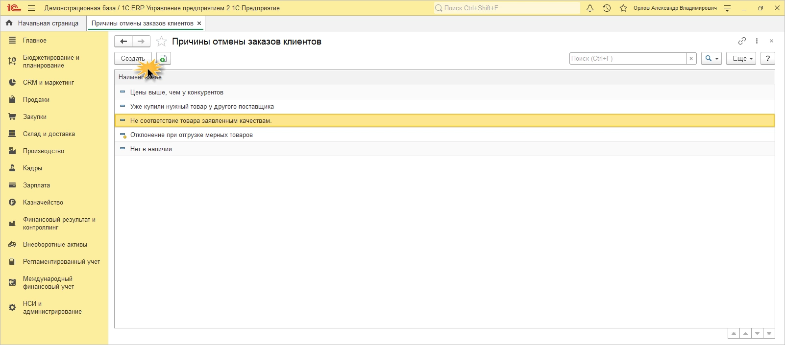 В результате в разделе продажи станет доступен одноименный справочник для ведения списка причин отказов клиентов. Этот список используется при описании факта отказа клиента от заказа.