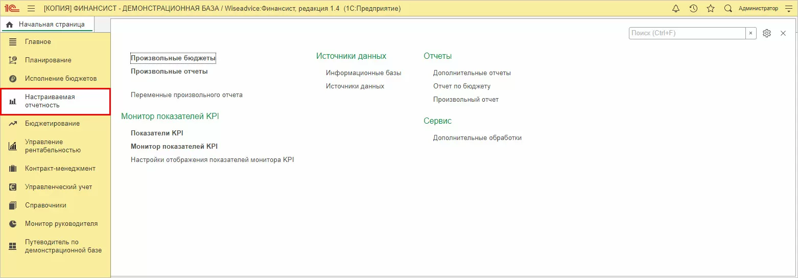 Программа «WA:Финансист» – специализированная разработка нашей компании, включает в себя инструменты анализа и планирования работы компании. Блок «Отчеты» в разделе «Главное» содержит множество полезных пунктов. Детальный анализ показателей с помощью «WA:Финансист» можно провести, используя раздел «Настраиваемая отчетность».
