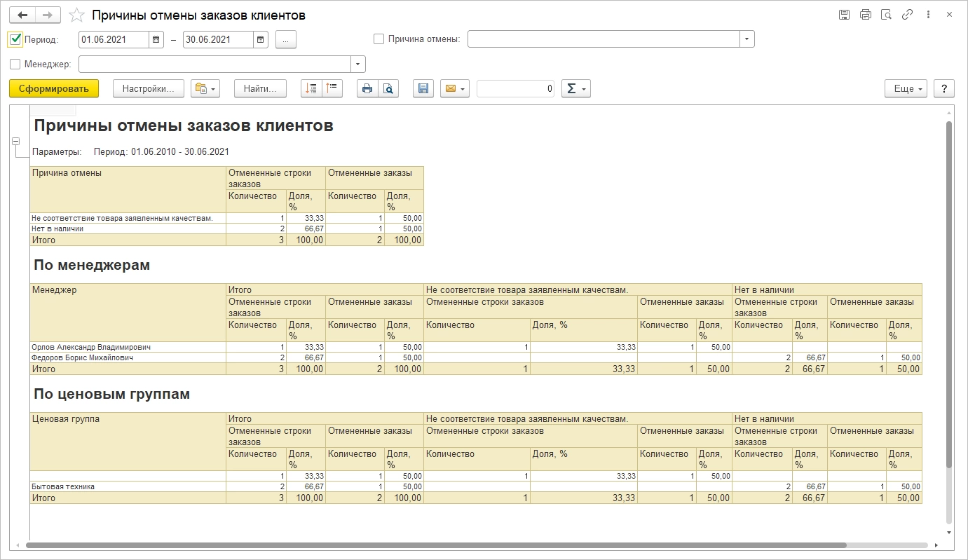 Один из отчетов – «Причины отмены заказов клиентов», позволяет проанализировать, почему клиент отказался от заказа, определить, у каких менеджеров с отказами обстоят дела хуже всех.