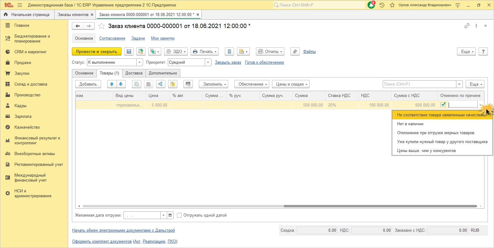 Анализ причин отмены заказов клиентов в «1С:ERP»