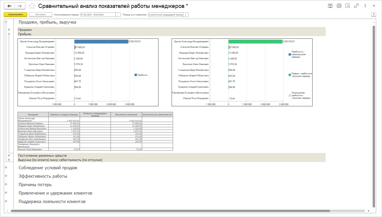 Задайте анализируемый период и нажмите «Сформировать». Кроме анализа прибыли, отчет в разрезе менеджеров по продажам дает информацию о продажах, соблюдении условий продаж, эффективности работы, потерях и привлечении клиентов.