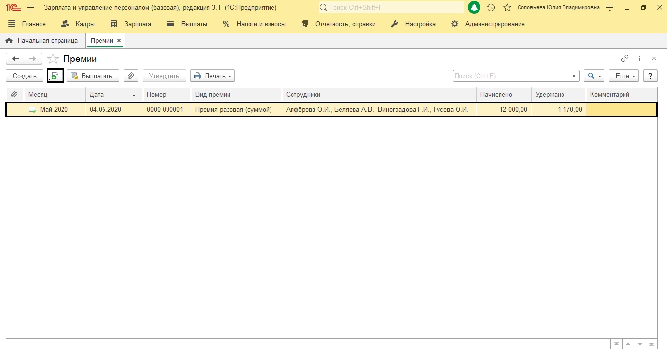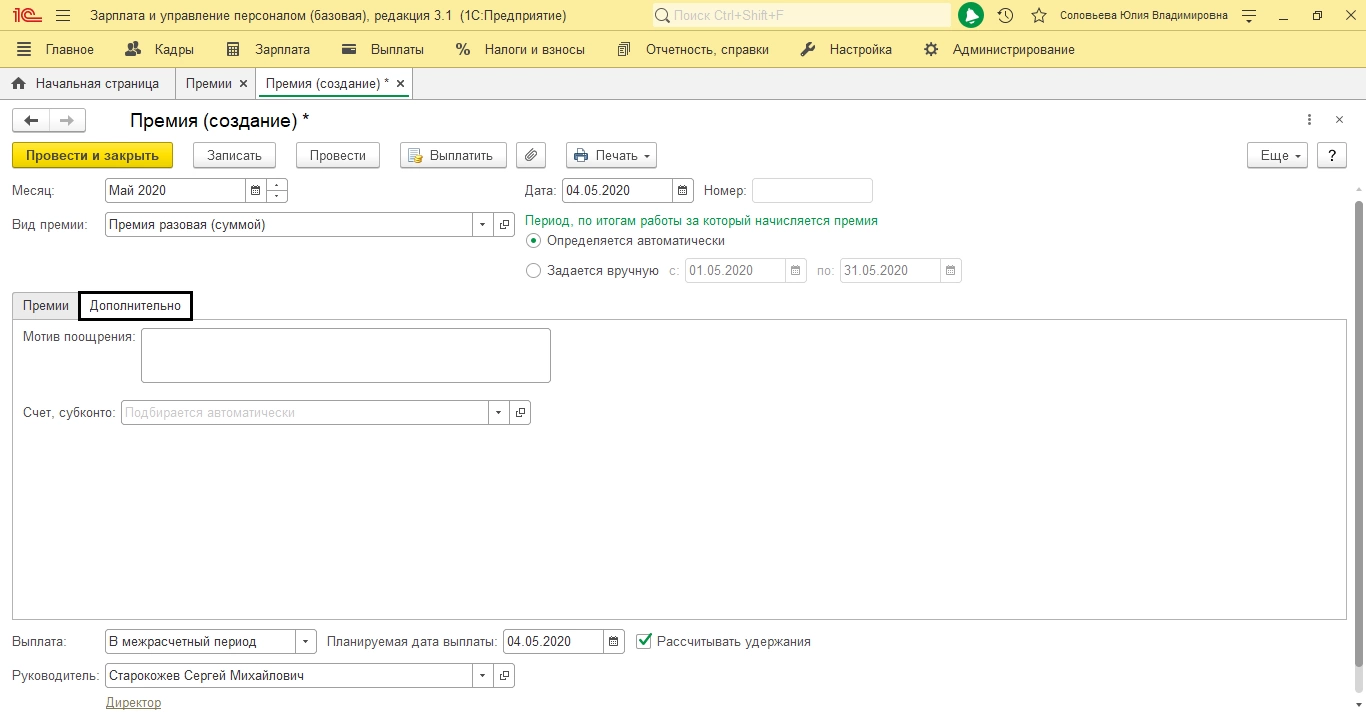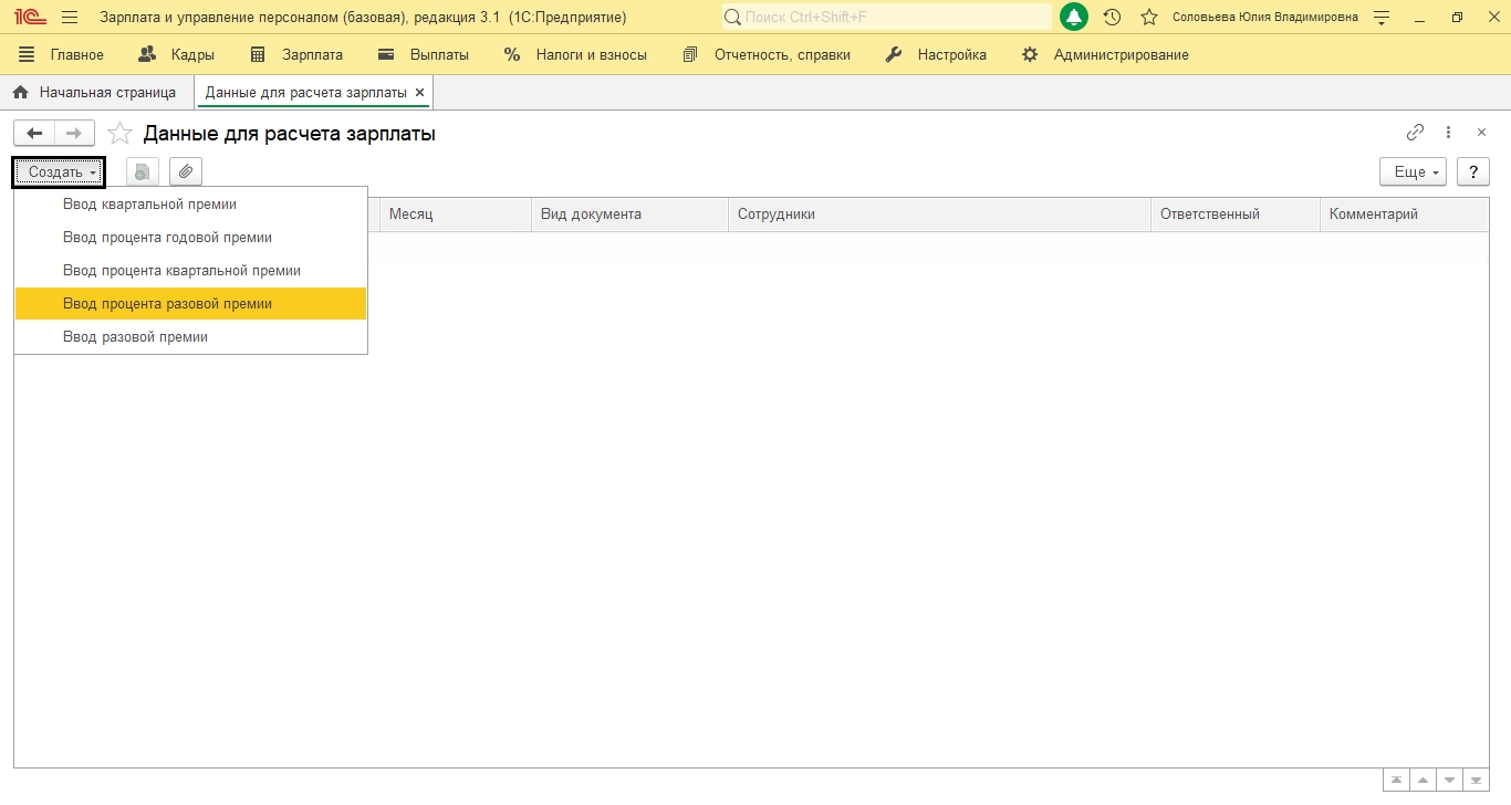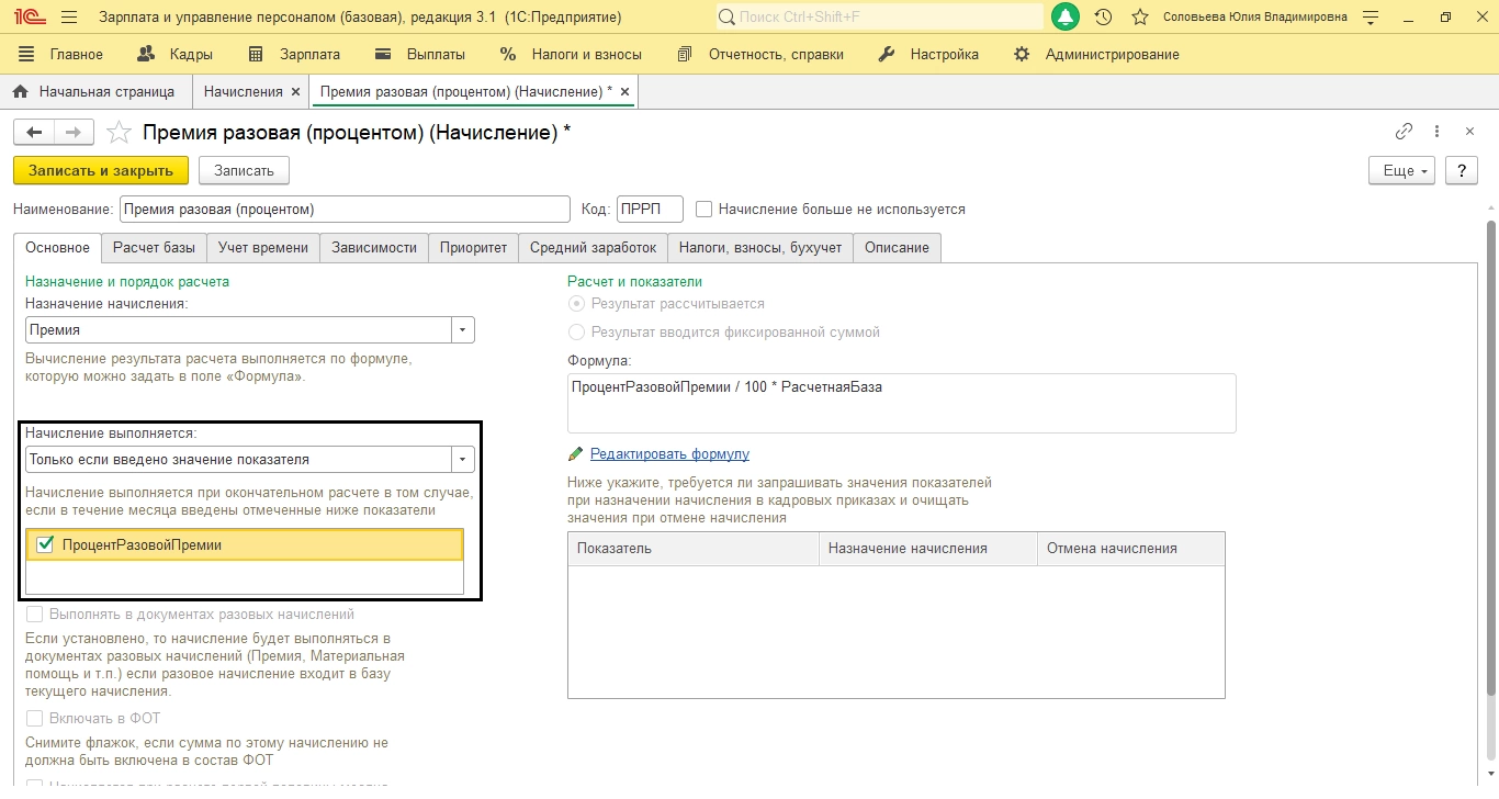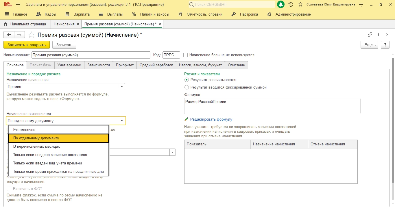 Точно так же задаются условия для разовой премии, но в отличие от всех предыдущих видов, ее начисляют отдельным документом.