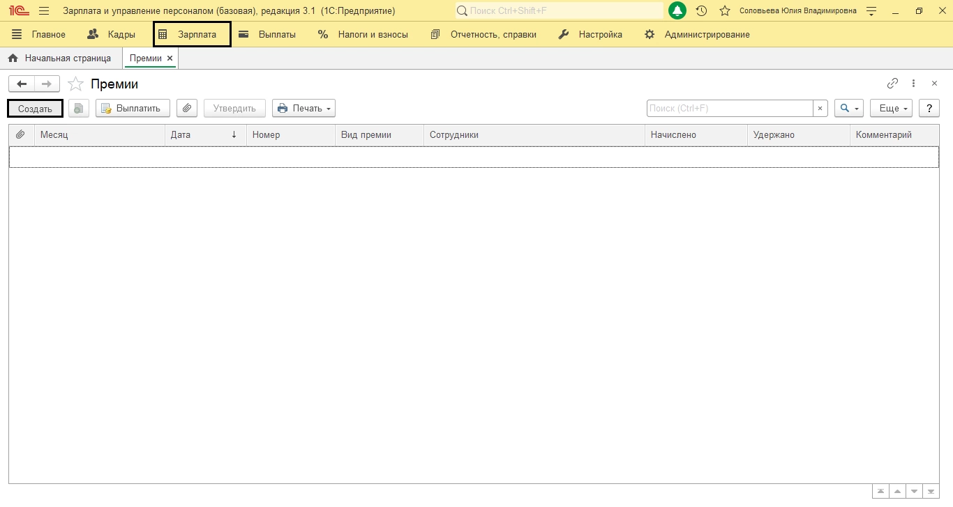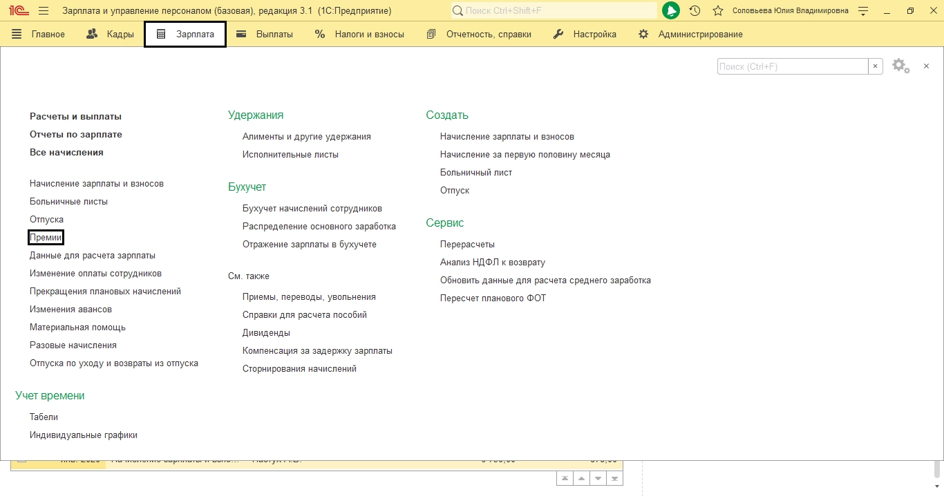 В результате такой настройки в разделе меню «Зарплата» появился пункт «Премии».
