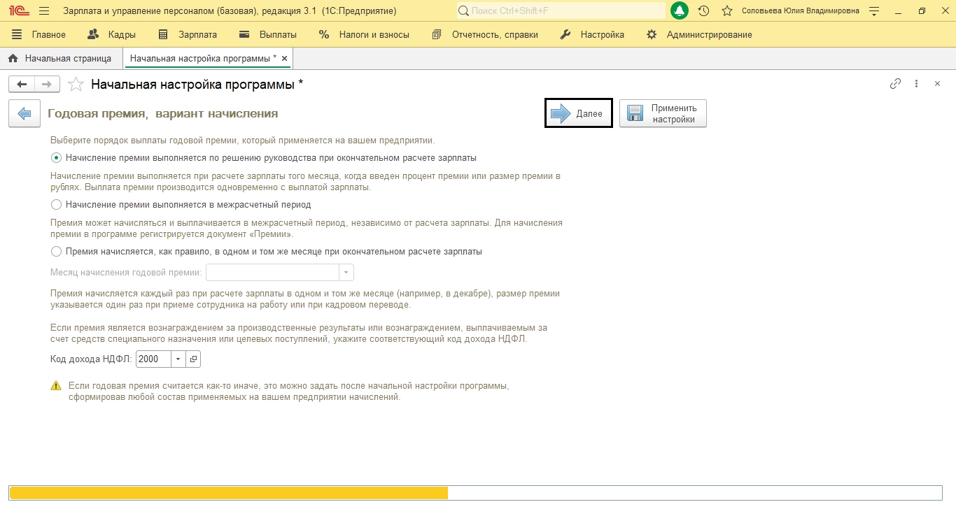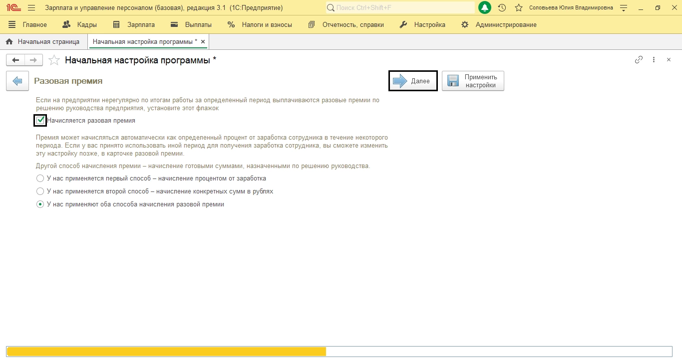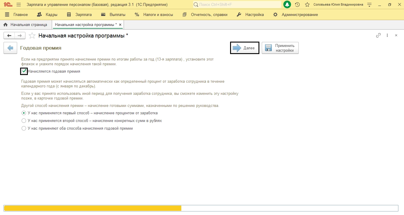 Настройки схожи с квартальной премией. Но в отличие от квартальной премии, для этой можно задать месяц начисления. Перейдите «Далее».