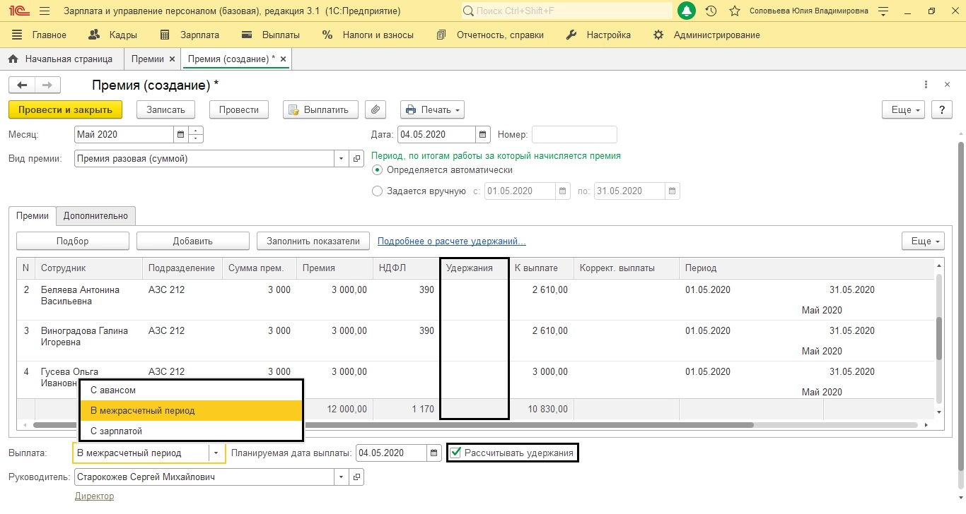 В случае выплаты премии вместе с зарплатой расчет удержаний производится при вводе документа «Начисление зарплаты и взносов». Если выплата производится с авансом или в любую другую дату в межотчетный период, то в документе появляется галочка «Рассчитывать удержания» и в таблице добавляются колонки «НДФЛ» и «Удержания». Если снять данную галочку, то колонка удержания скроется из таблицы, но «НДФЛ» останется.