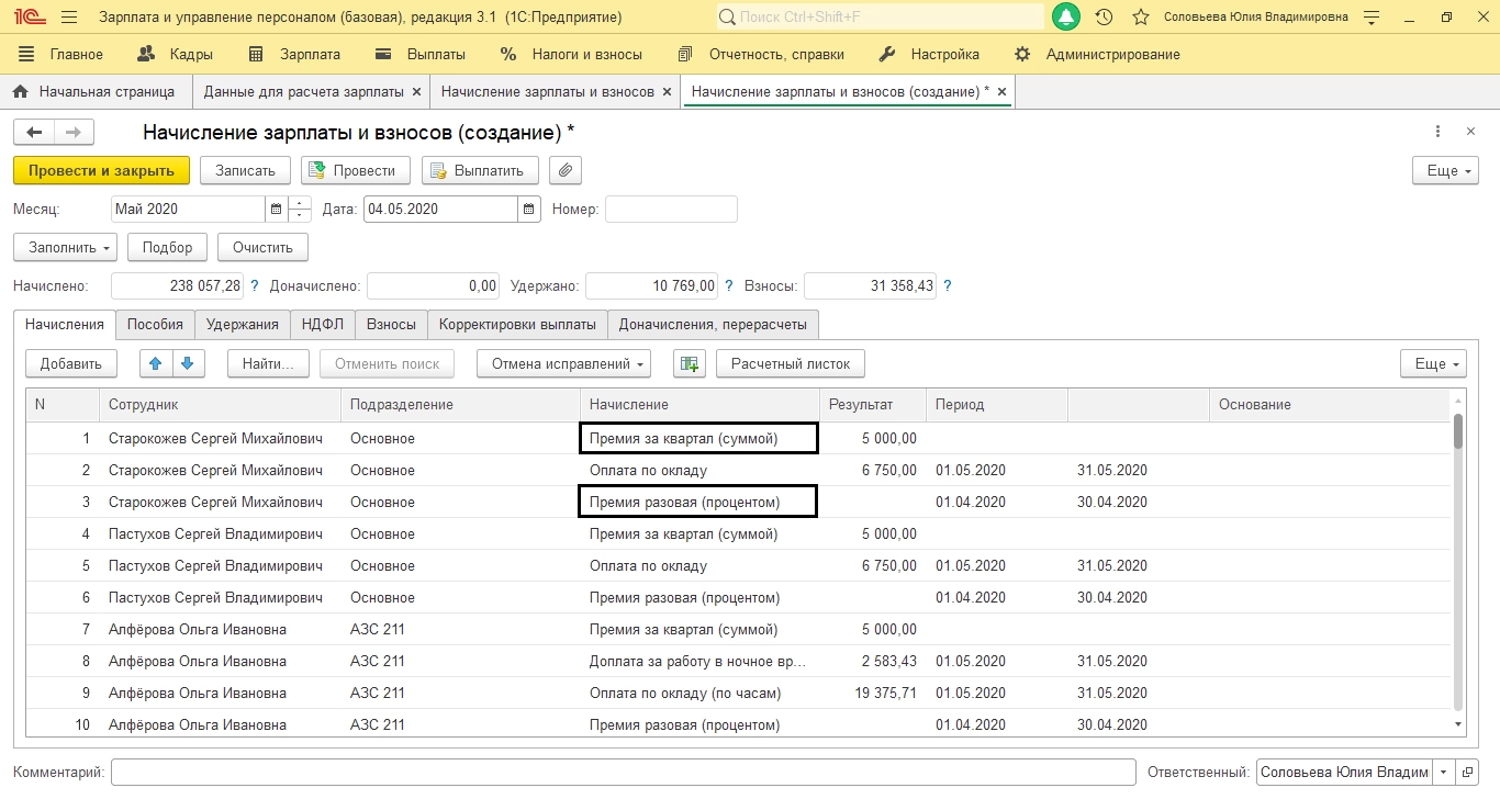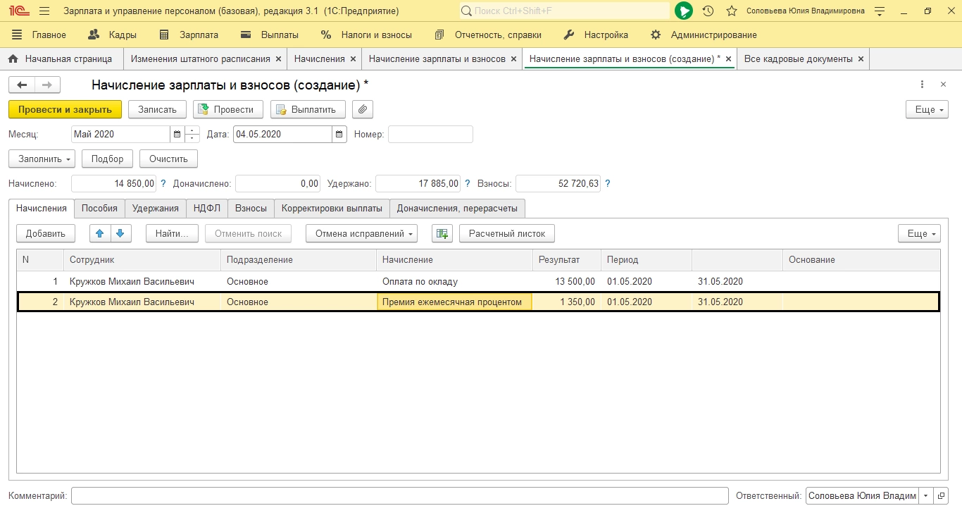 Начисление премии производится при окончательном расчете зарплаты. Введите документ «Начисление зарплаты и взносов». У сотрудников отражены начисления, показатели для которых были введены документом.