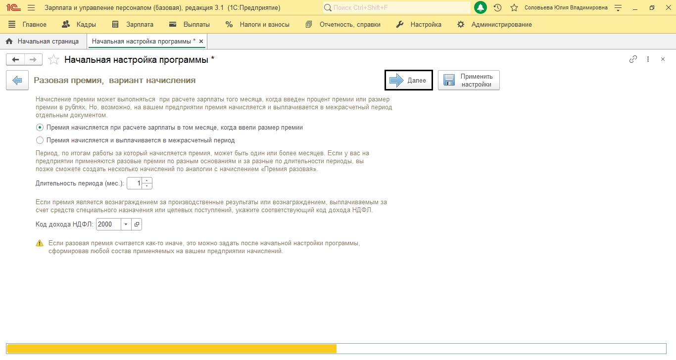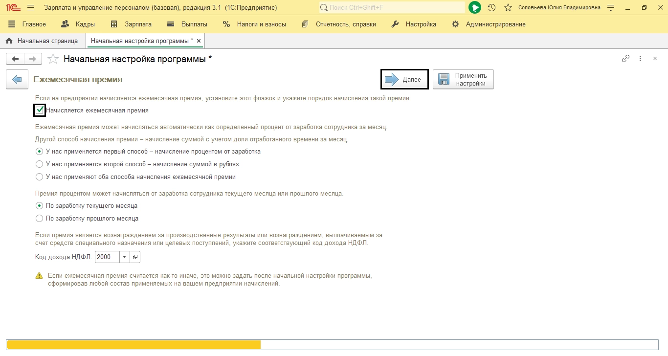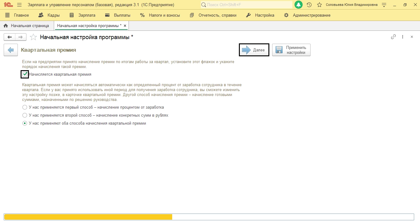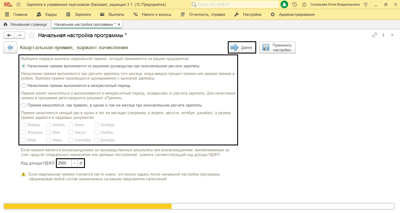 Установив настройки квартальной премии, перейдите через нажатие «Далее».