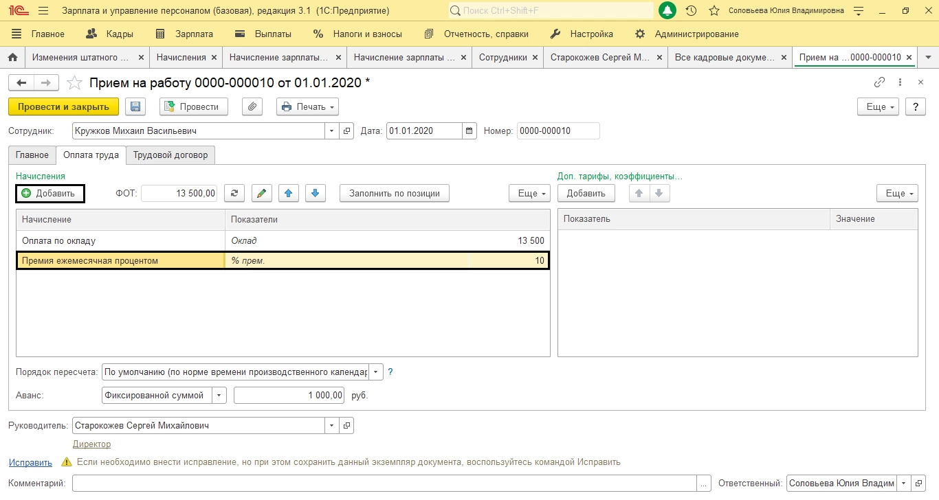 2. Если штатное расписание не ведется, то премия может включаться в состав начислений сотрудника в документе при приеме на работу сотрудника, при кадровом перемещении – кнопка «Добавить» в окне состава начислений, вкладка «Оплата труда».