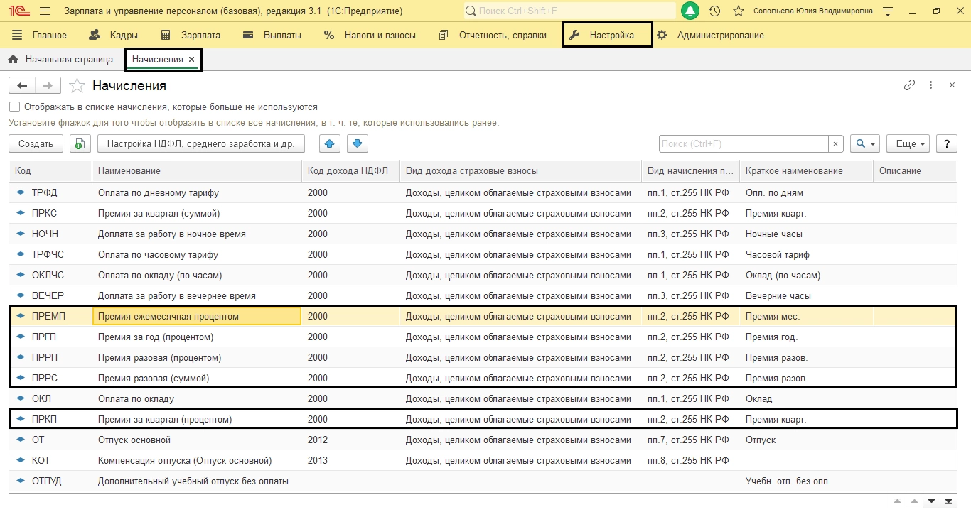 После окончания настройки разделов премирования, в разделе меню «Настройки-Начисления» появятся виды заданных вами премий.