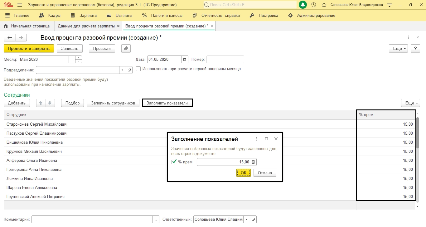 Выберите нужный вид премии. Для примера зададим процент разовой премии. Заполнив табличную часть сотрудниками (кнопка «Заполнить сотрудников»), нажмите «Заполнить показатели». В открывшемся окне укажите процент премии. Данные показатели переносятся в таблицу.