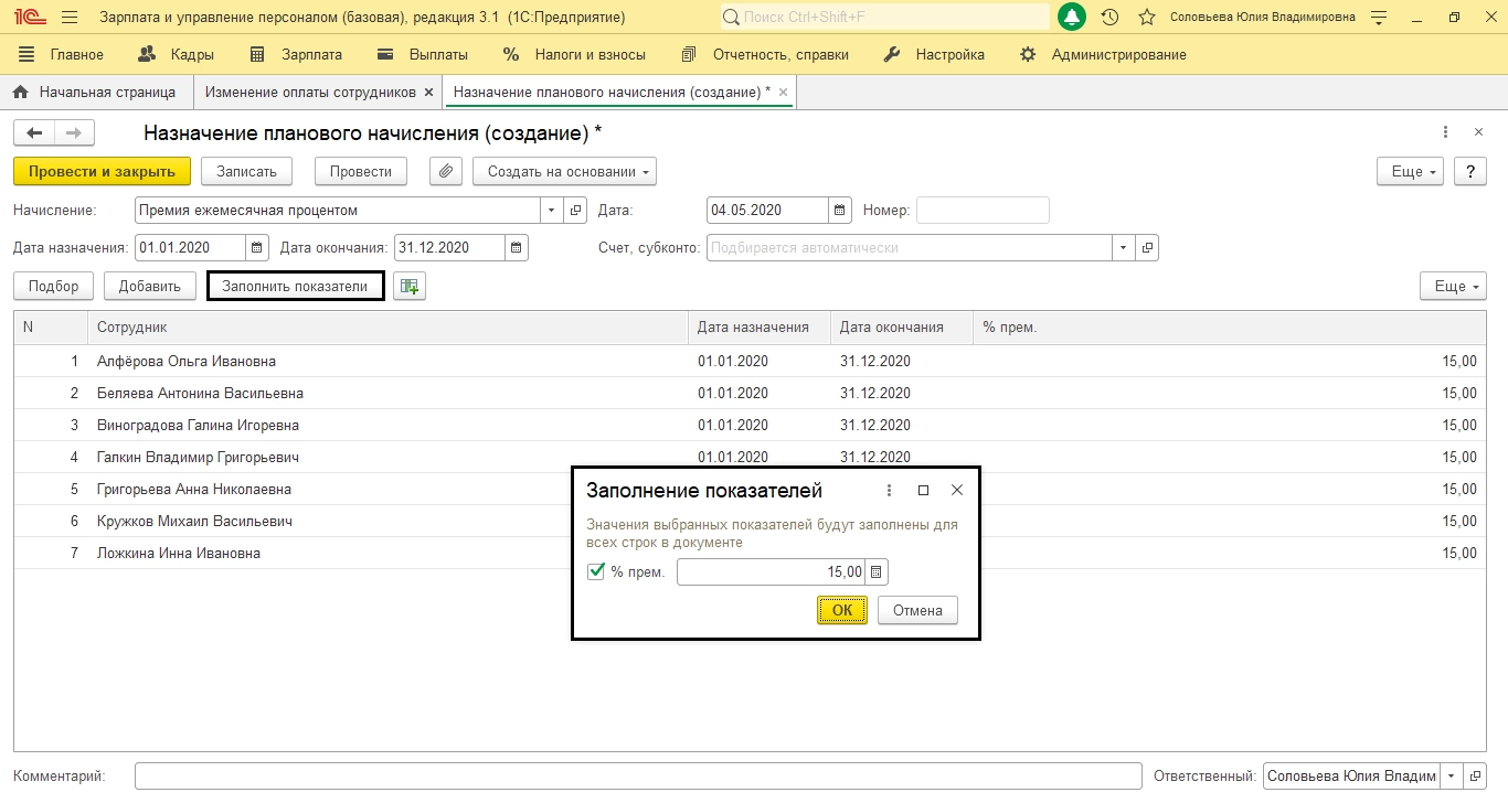 3. В разделе «Кадры-Изменение оплаты сотрудников» выберите документ «Изменение планового начисления». Документ заполняется так же, как рассмотрено выше. Выберите начисление «Премия ежемесячная процентом», укажите период действия начисления, сформируйте список сотрудников. Нажав кнопку «Заполнить показатели», задайте процент премии.