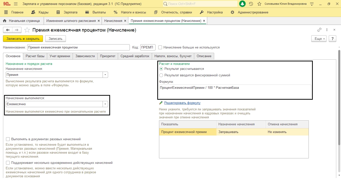Документ сформирован. В настройках данного вида премии установлено, что она начисляется ежемесячно. Это означает, что при начислении зарплаты начисление премии произойдет автоматически. Данное начисление задается в процентах и использует расчетную базу.