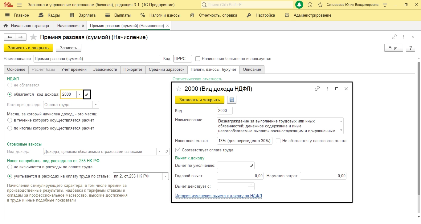 В окошке, где указан код дохода, можно открыть данный элемент для просмотра и при необходимости задать для него дополнительные параметры.