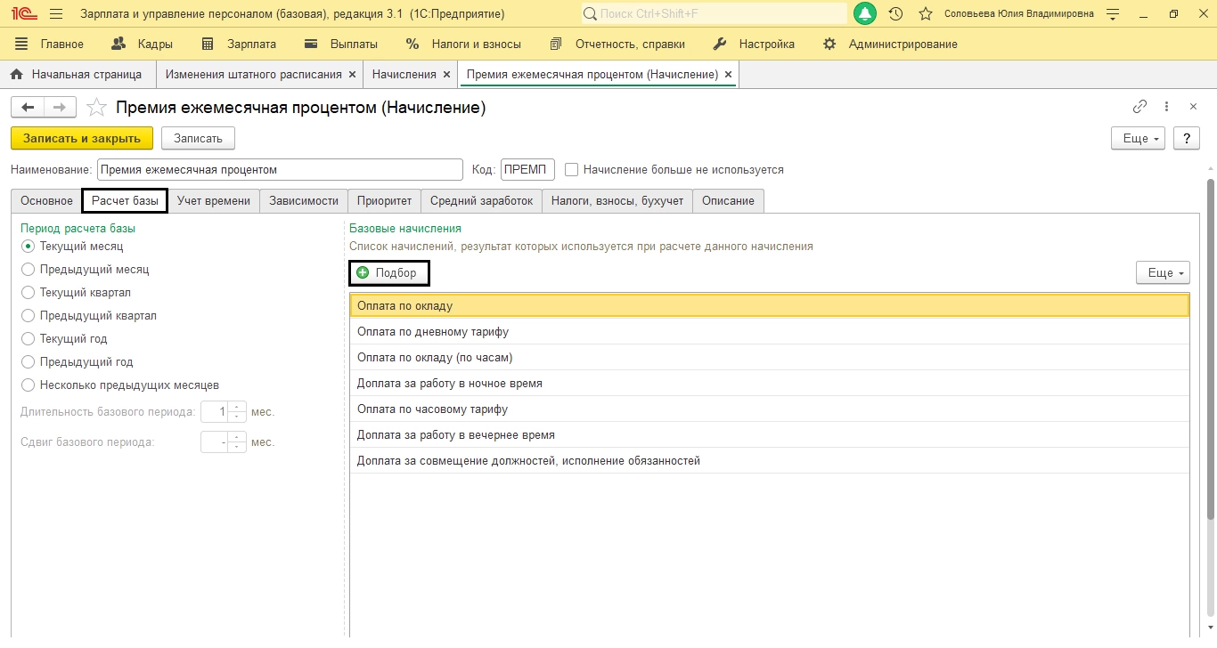 На вкладке «Расчет базы» проверьте ее состав и порядок расчета. При необходимости можно добавить или исключить базовые начисления, в зависимости от порядка расчета предусмотренного в организации по кнопке «Подбор».
