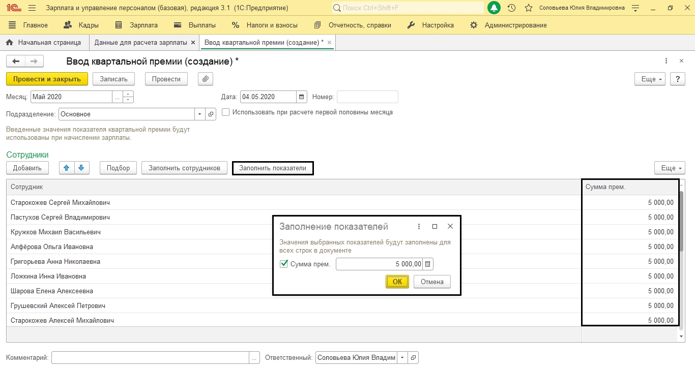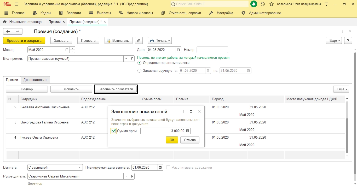 В табличной части в строке с сотрудниками автоматом заполнился период и месяц начисления. Сумму премии можно проставить для каждого сотрудника вручную или, если она одинаковая для всех, воспользовавшись кнопкой «Заполнить показатели». В открывшемся окне укажите сумму премии. По всем сотрудникам она заполнится автоматом. При необходимости суммы можно подкорректировать.