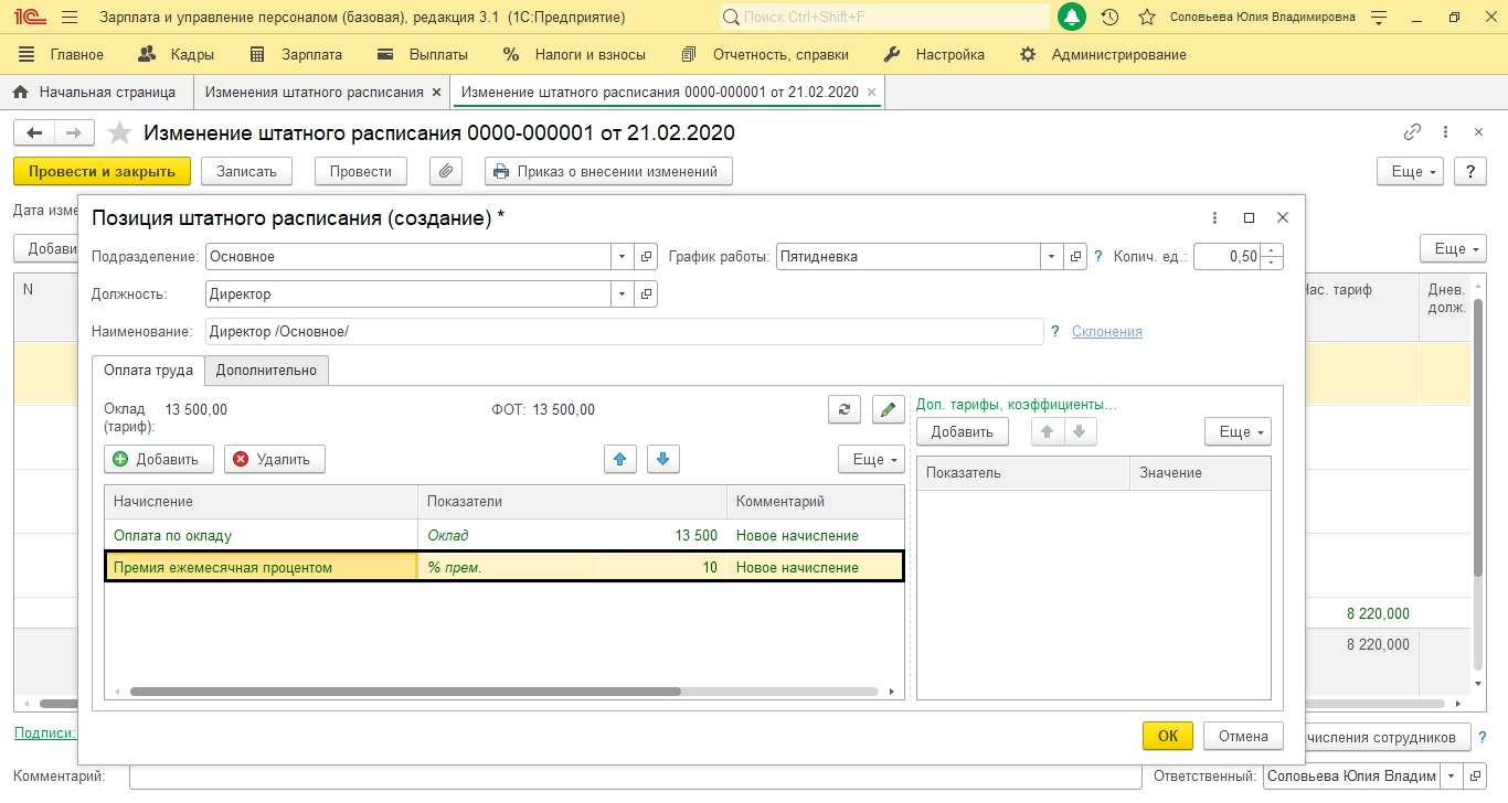 - Оно может быть предусмотрено штатным расписанием, закреплено за определенными должностями через «Кадры-Изменения штатного расписания».