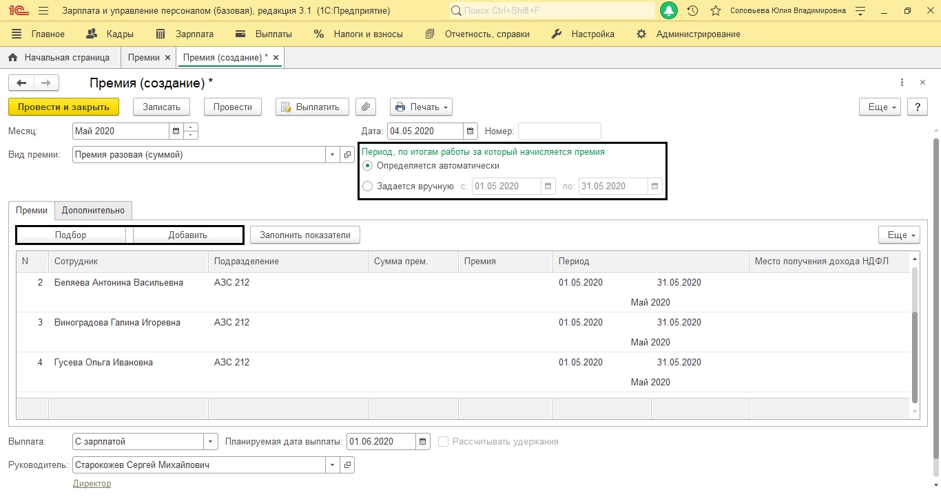 Заполните шапку документа – укажите месяц, дату, выберите вид премии. Период начисления определяется автоматом или может быть задан вручную – для выбора установите переключатель в соответствующее положение. С помощью кнопок «Подбор» или «Добавить» заполните табличную часть документа списком сотрудников.