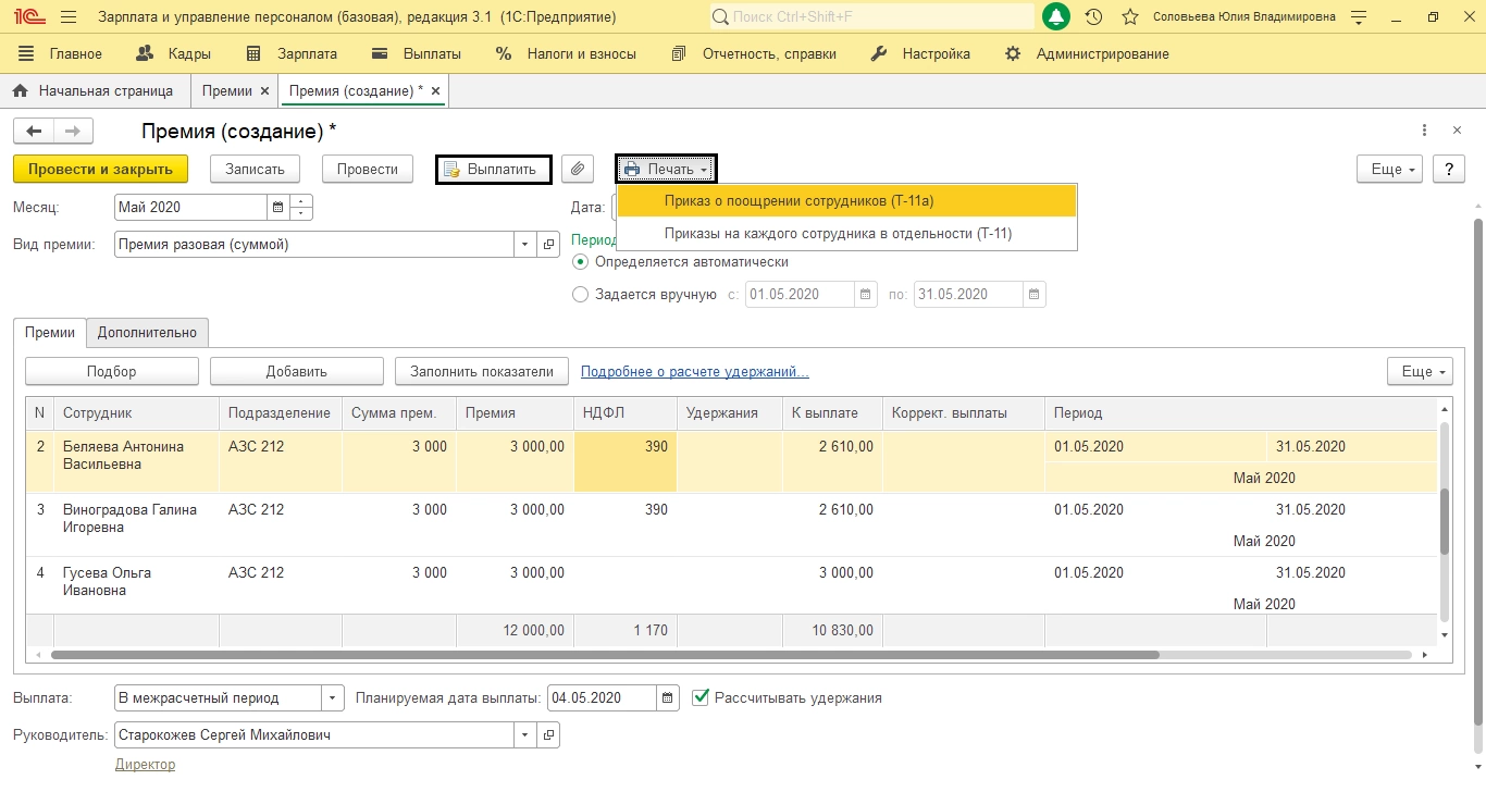 Можно сформировать выплату премии отдельно по документу «Премия», кнопка «Выплатить». Перед печатью и выплатой документ необходимо провести.