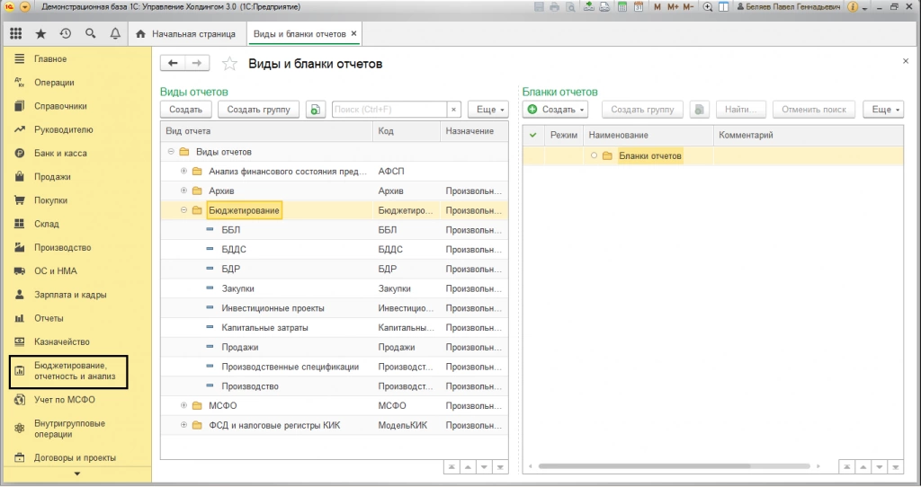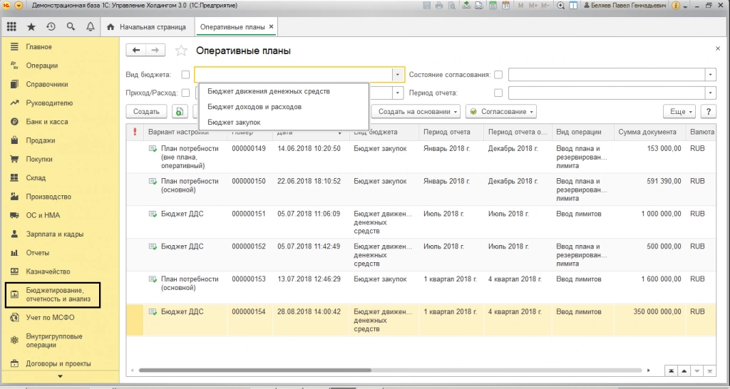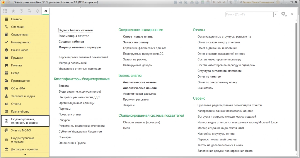 Конфигурации «1С:ERP Управление предприятием» и «1С:Управление холдингом» имеют модули бюджетирования и казначейства, но используют при этом разные источники информации. В программе 1С для автоматизации холдинга основным инструментом бюджетирования являются отчеты, настройки которых включают инструменты интеграции внешних данных. Функционал бюджетирования в этой конфигурации позволяет пользователю разрабатывать бюджетные модели, определять аналитики и показатели, а также отчетность различного назначения, используя различные варианты расчета прогнозировать динамику показателей, при этом консолидировать и распределять их.