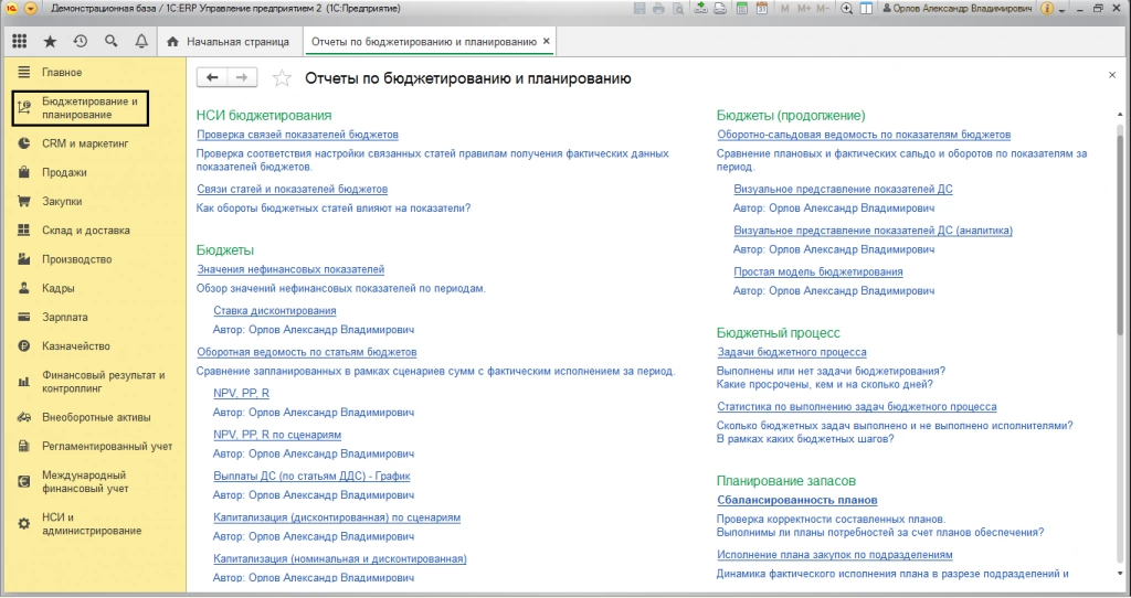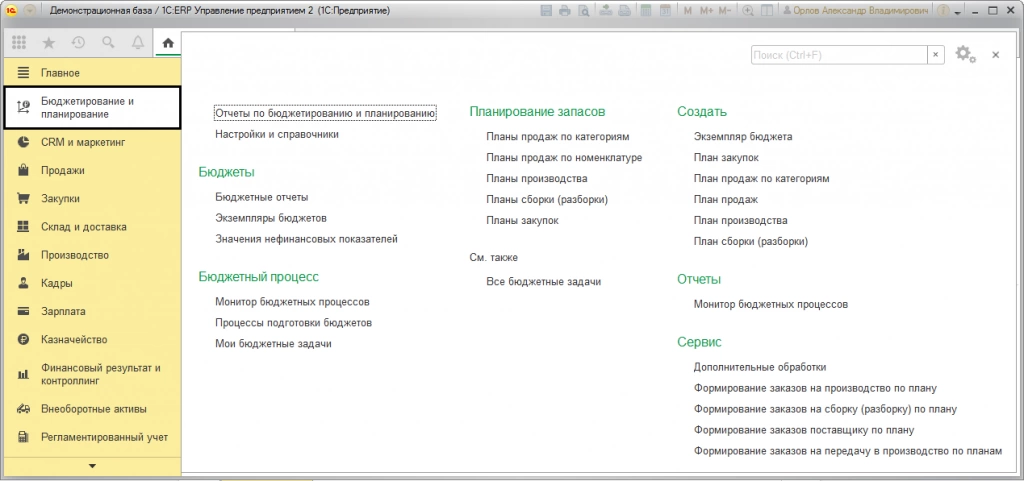 Функционал конфигурации «1С:ERP Управление предприятием» включает универсальный набор инструментов финансового планирования на предприятии. Автоматизация бизнеса на основе 1С:ERP в части бюджетирования дает возможность моделировать финансовые планы предприятия с учетом имеющихся ресурсов, осуществлять планирование оплат по планам продаж и закупок, контролировать расходы денежных средств, исходя из установленных лимитов. В отдельные разделы выделено планирование запасов в разрезе - «Планы продаж по категориям», «Планы продаж по номенклатуре», «Планы производства», «Планы сборки (разборки)», «Планы закупок».