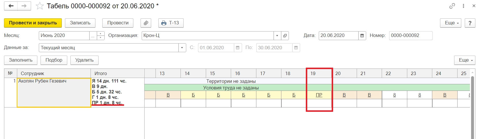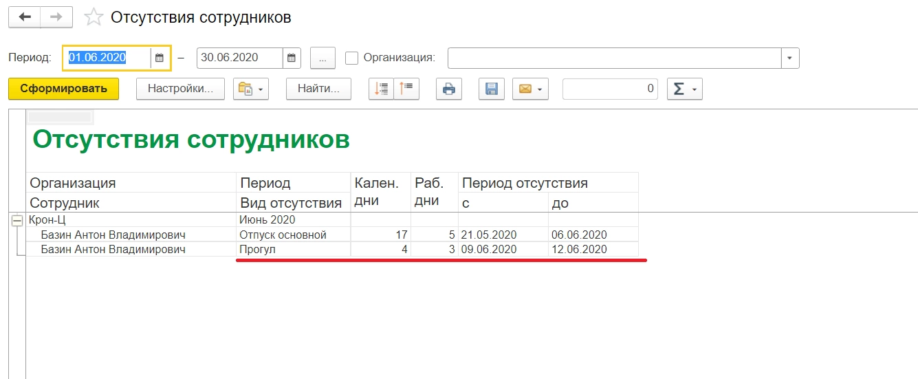 Как видим, факт отсутствия сотрудника отразился в табеле учёта рабочего времени.