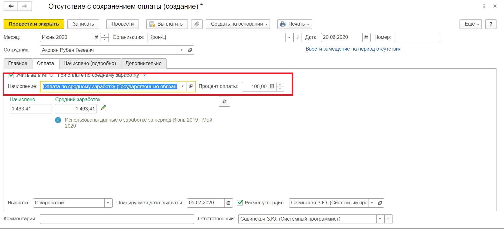 - Документ, где регистрируется факт отсутствия на рабочем месте, но это время оплачивается работнику с сохранением среднего заработка. Таковым в программе является документ «Отсутствие с сохранением заработной платы».