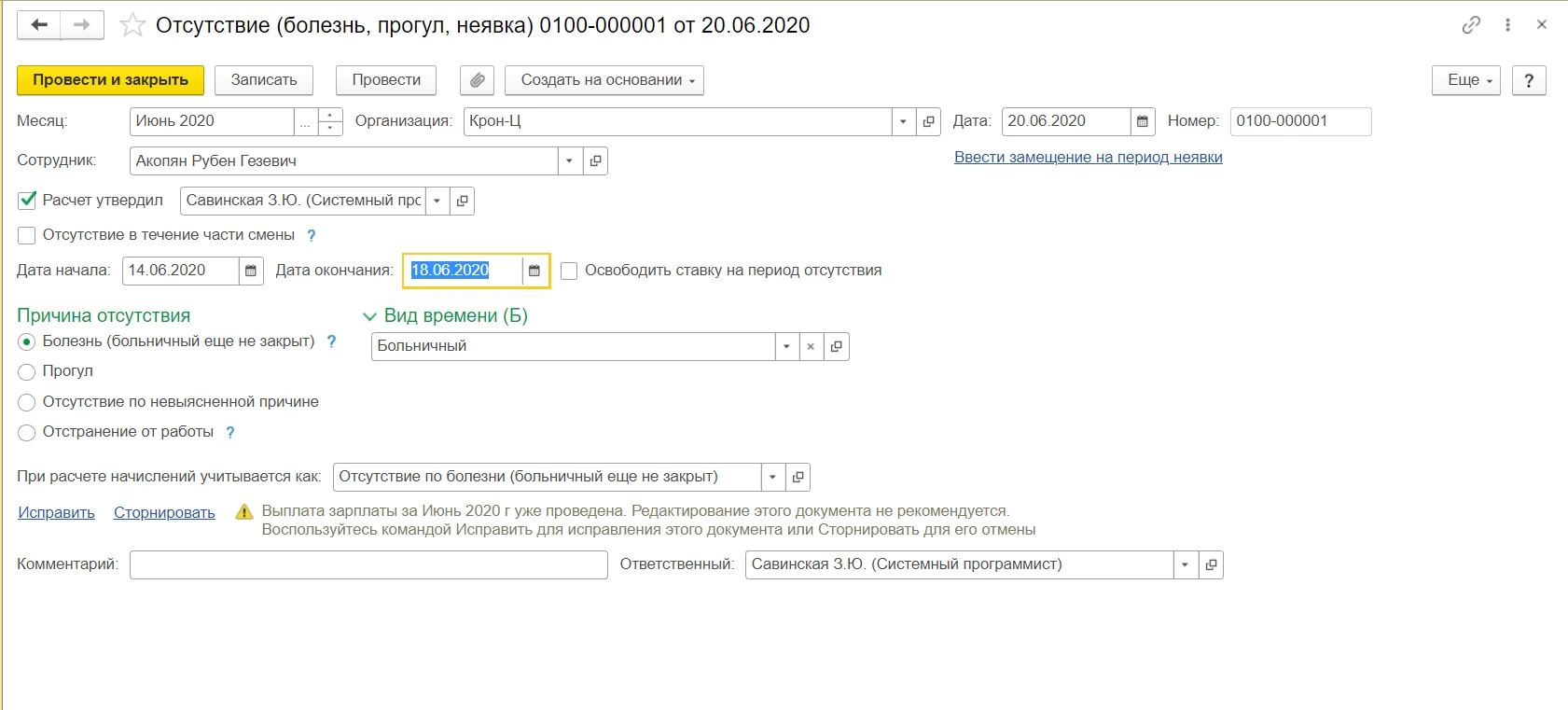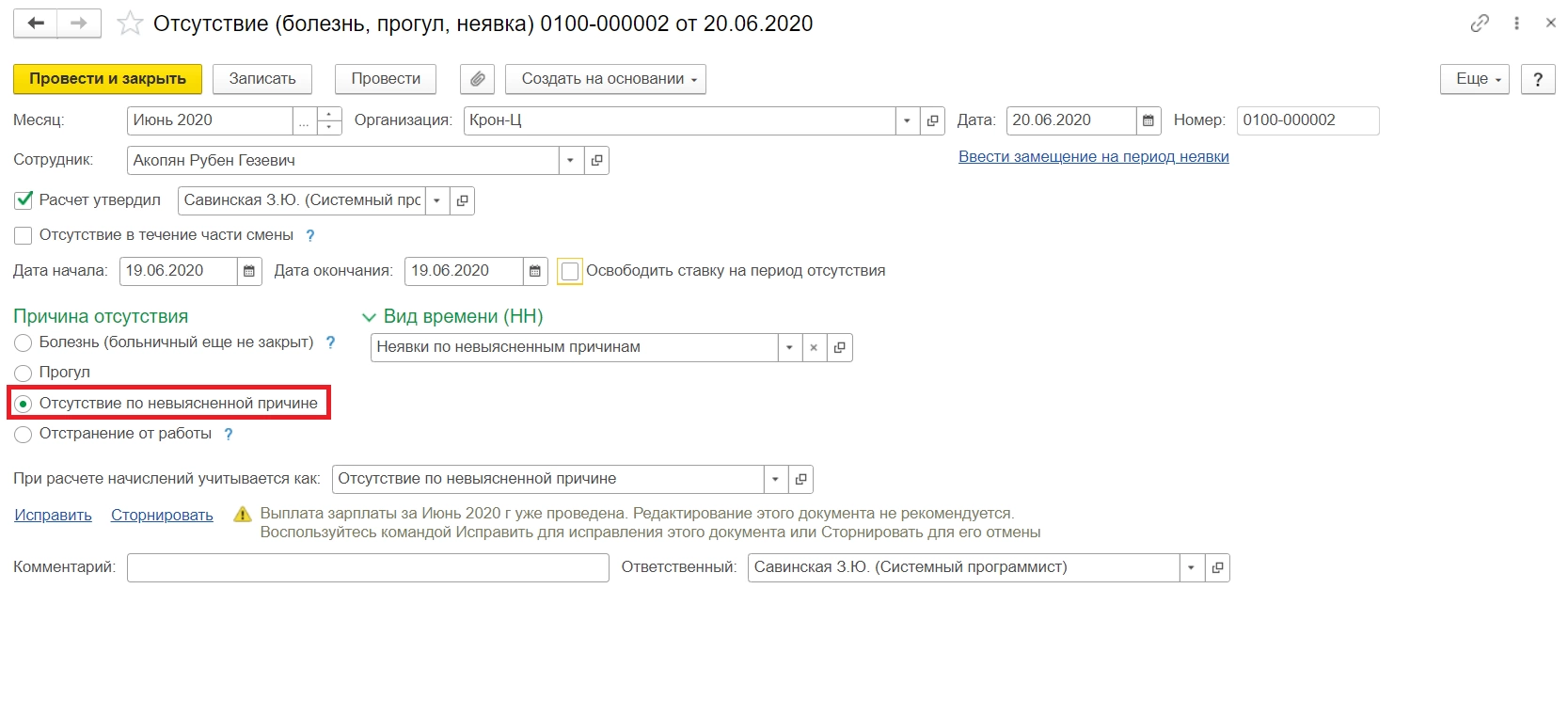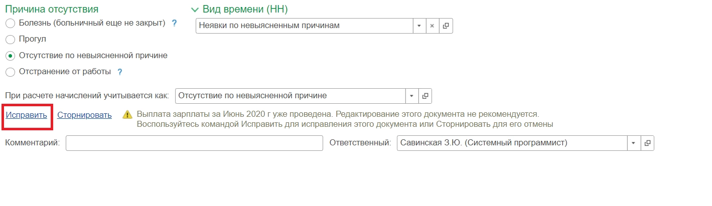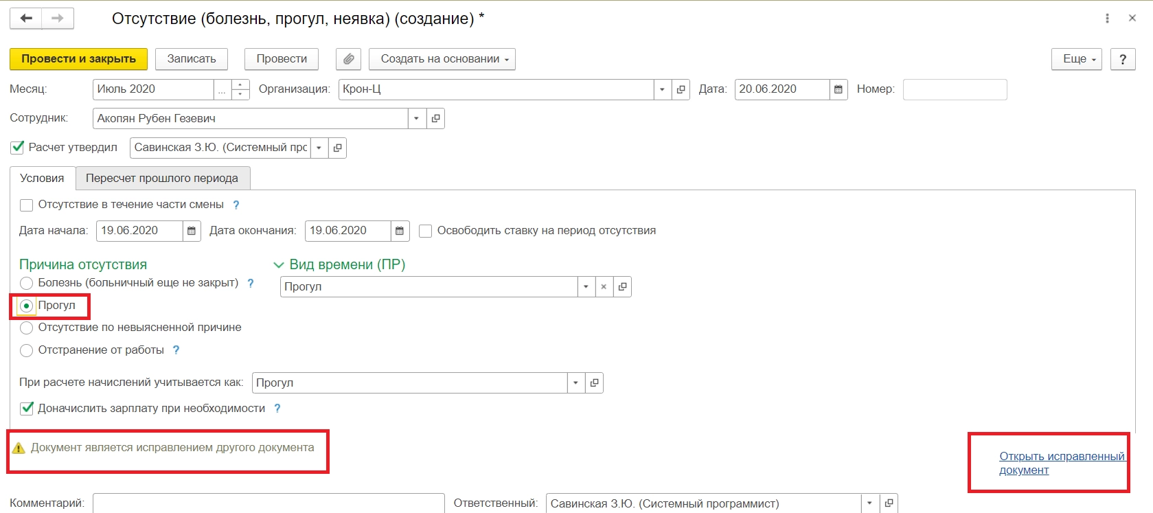 Откроется документ-исправление, в котором необходимо выставить причину отсутствия «прогул» и провести его.