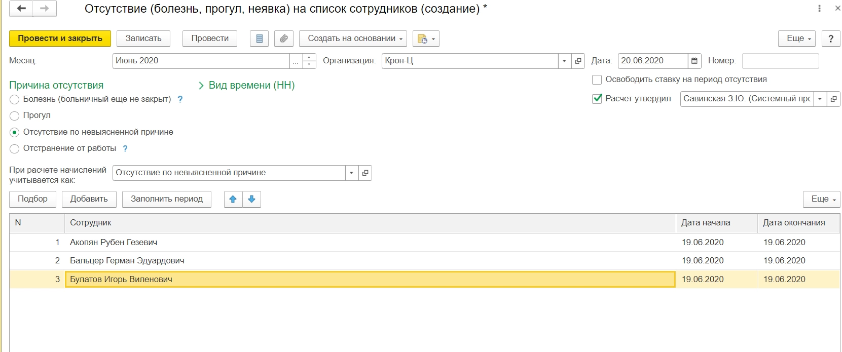 Также, в 1с ЗУП, возможно оформить документ «Отсутствие (болезнь, прогул, неявка) на список сотрудников», если неявка произошла у нескольких сотрудников по одинаковой причине.