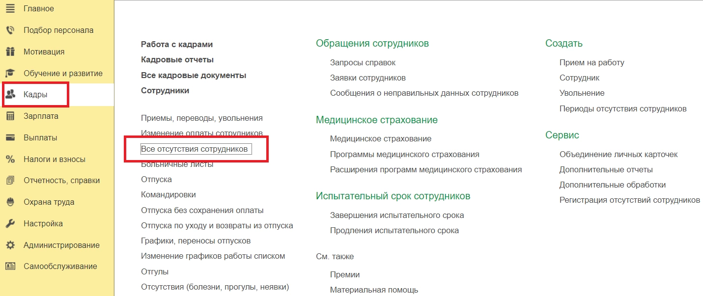 Как мы говорили выше, есть два вариант документов для регистрации факта отсутствия сотрудников - это «Отсутствие с сохранением заработной платы» и «Отсутствие (болезнь, прогул, неявка). Оба этих документа, возможно оформить через журнал «Все отсутствия сотрудников», расположенный в разделе «Кадры»
