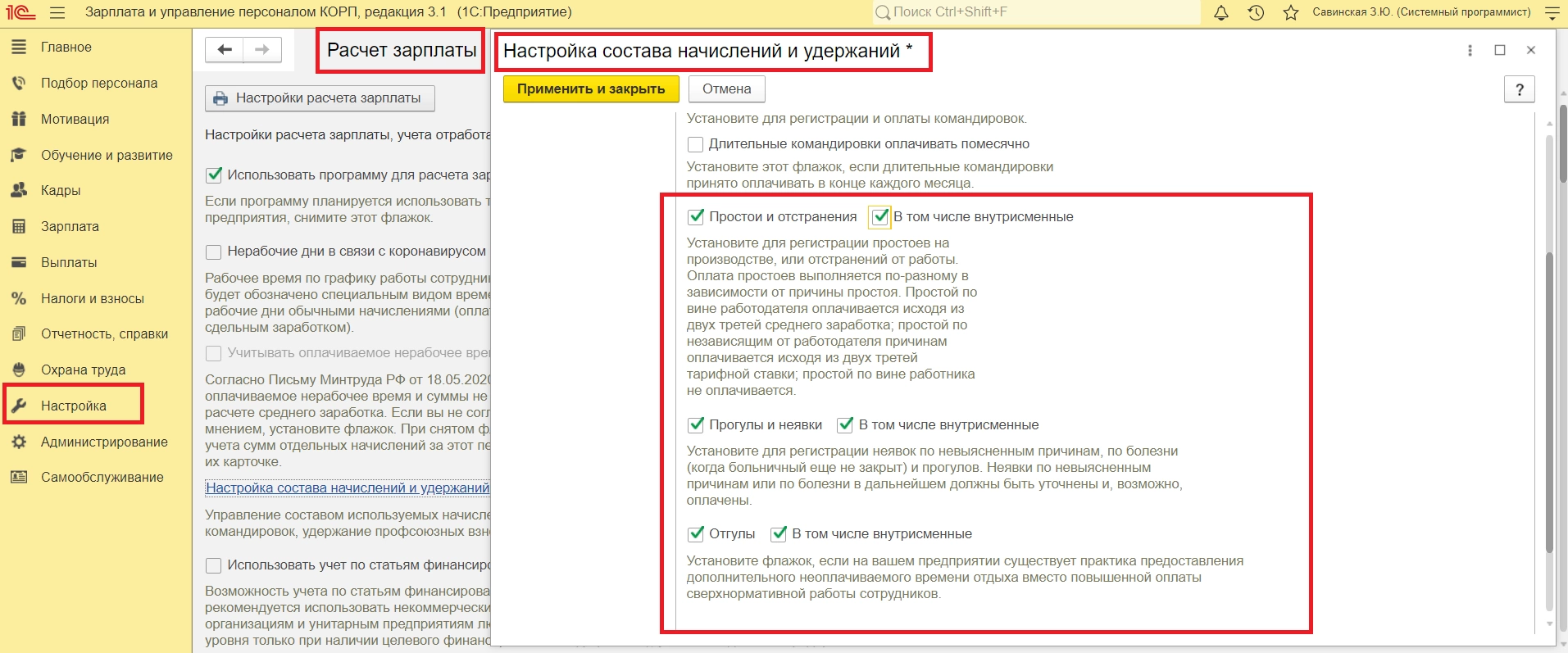 Ставим галочки напротив тех пунктов, которые нам нужны. Прежде всего, для нас важно чтобы вёлся учёт прогулов и неявок, в том числе и внутрисменные.