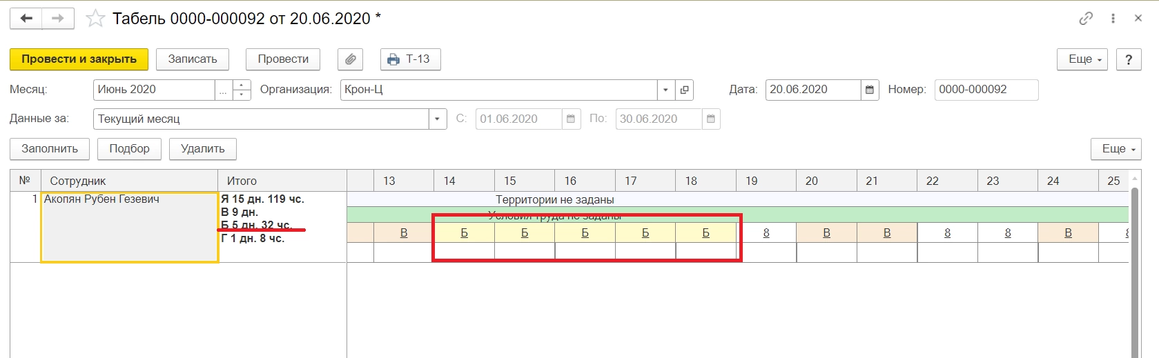 После заполнения информации, документ необходимо провести. В табеле учёта рабочего времени отразится факт отсутствия сотрудника по причине болезни.